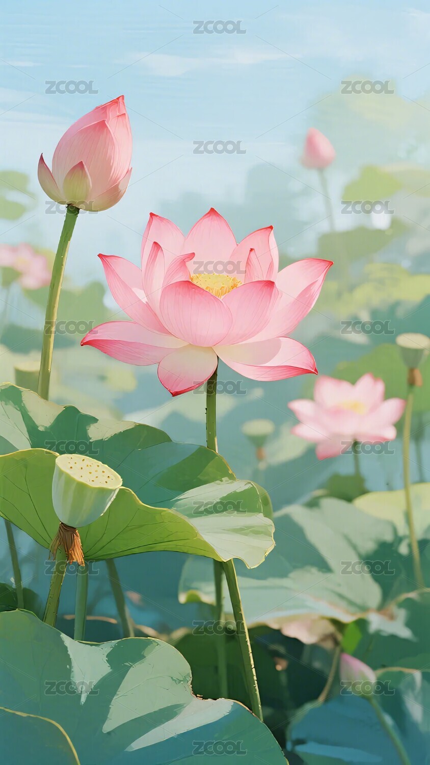 清新,荷花,植物,夏天,自然,自然美,花,户外,插画,绿色