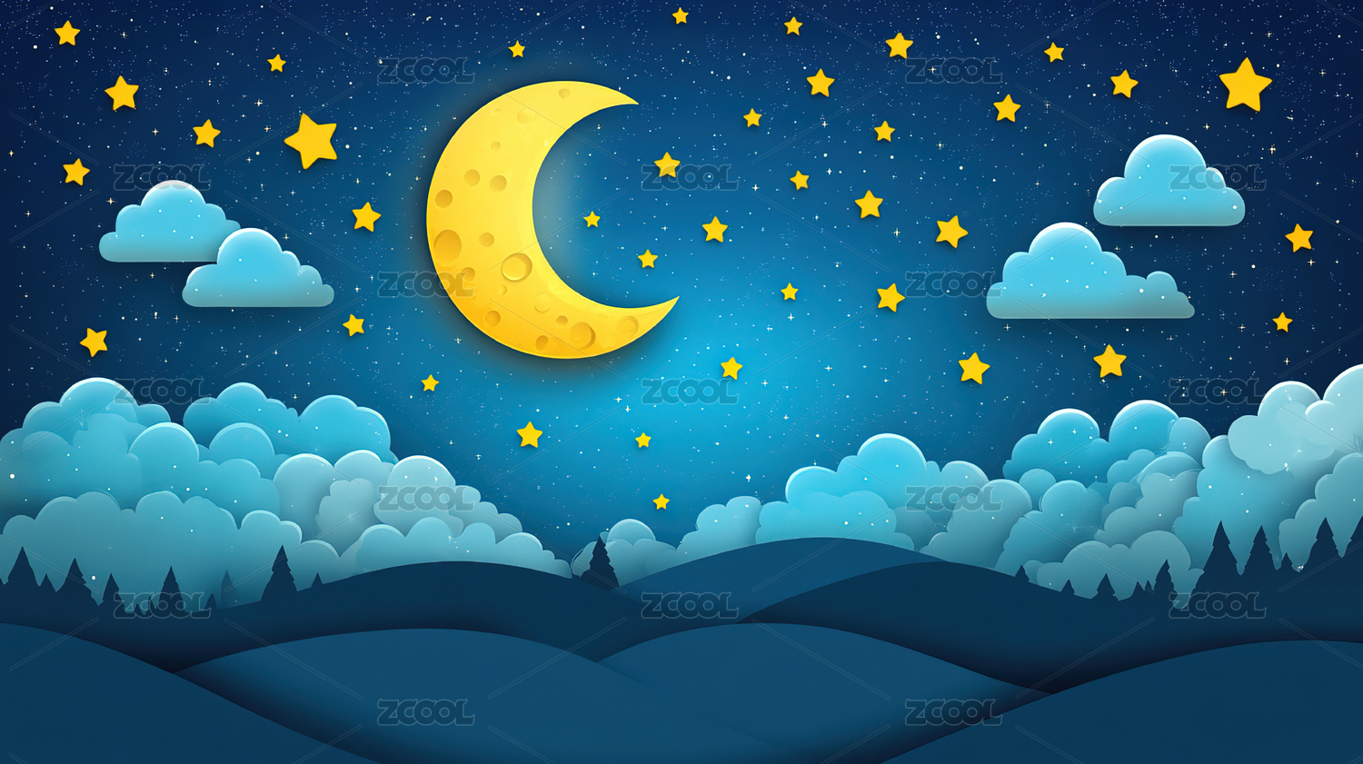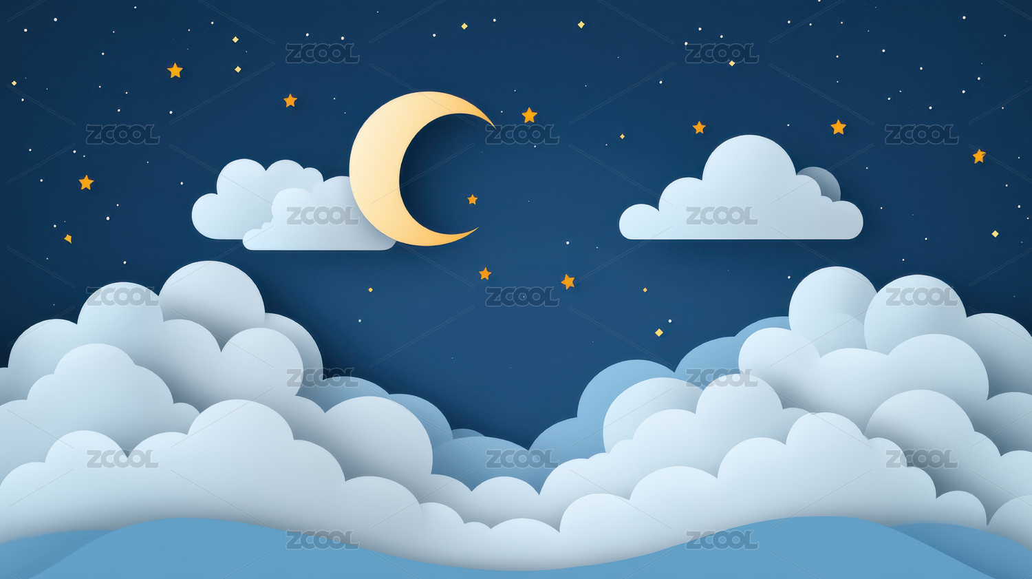 卡通剪纸插画云朵与弯弯的月牙