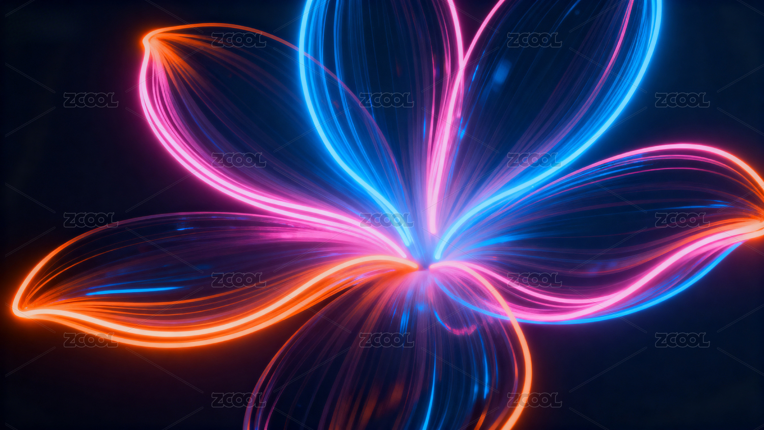 黑背景烟雾流动的荧光色3D全息透明花朵