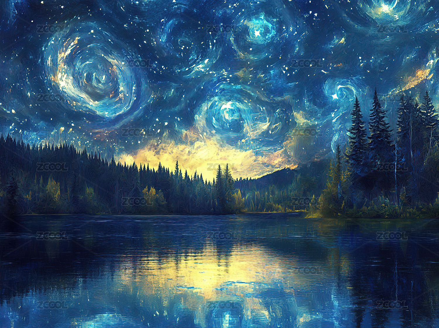 梦幻冬日雪中星空树下水边绘画般的梦境