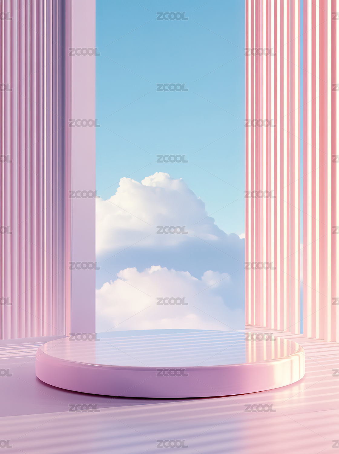 粉色圆台与云景背景的梦幻场景