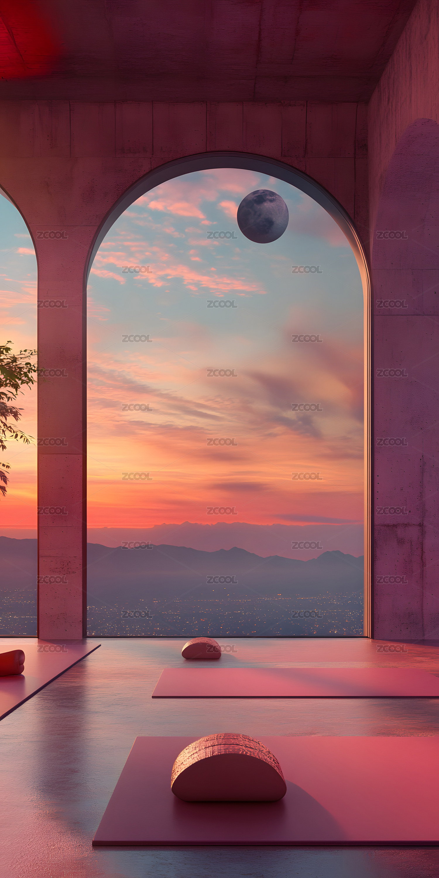 夕阳下海边室内瑜伽静谧空间