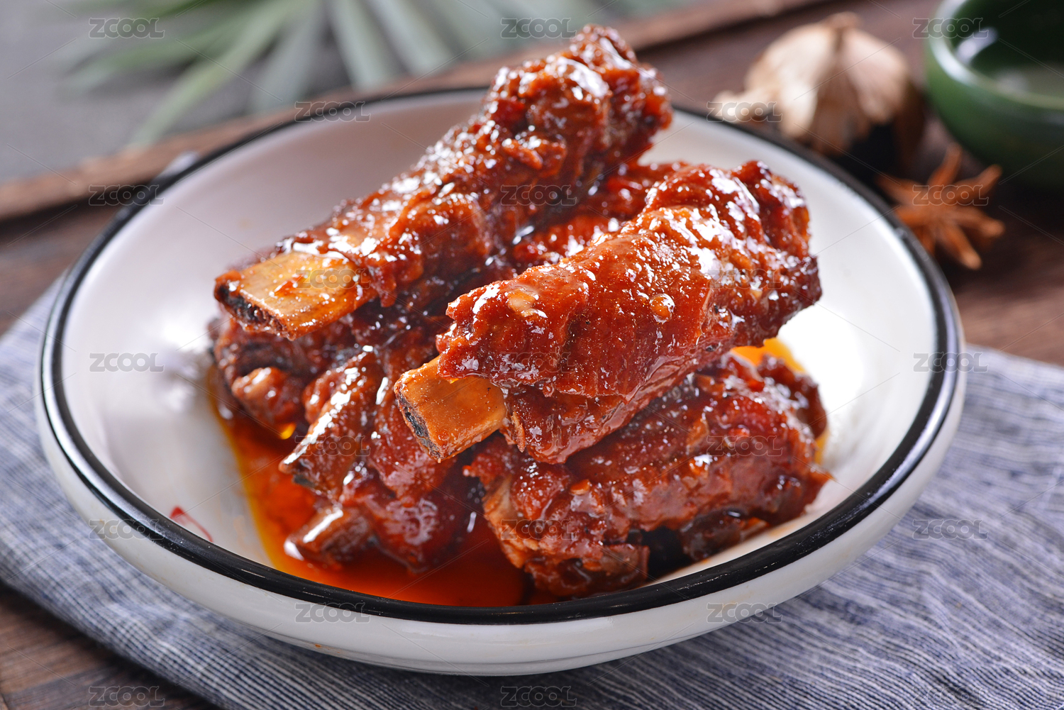 小份红烧排骨放在木板上