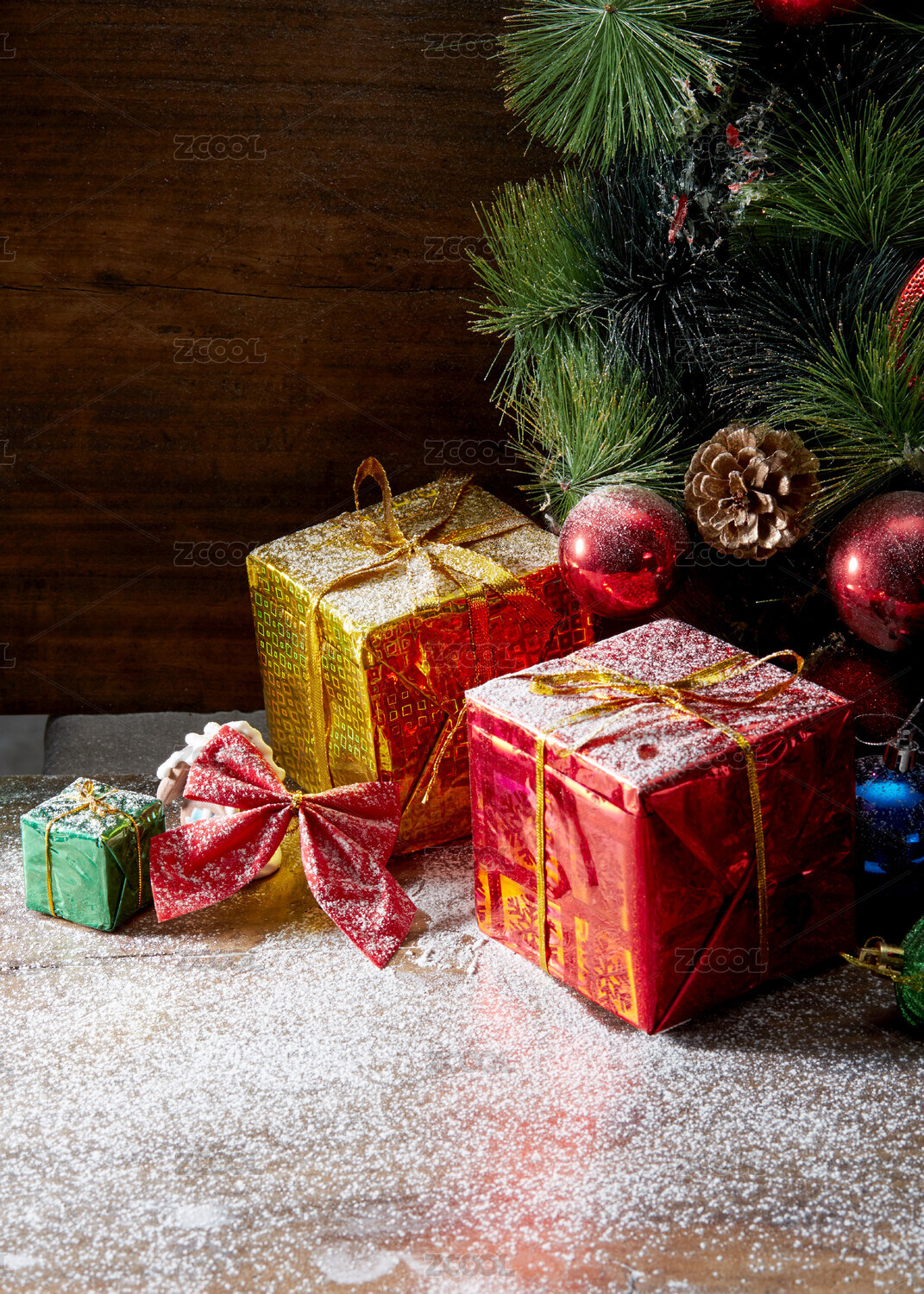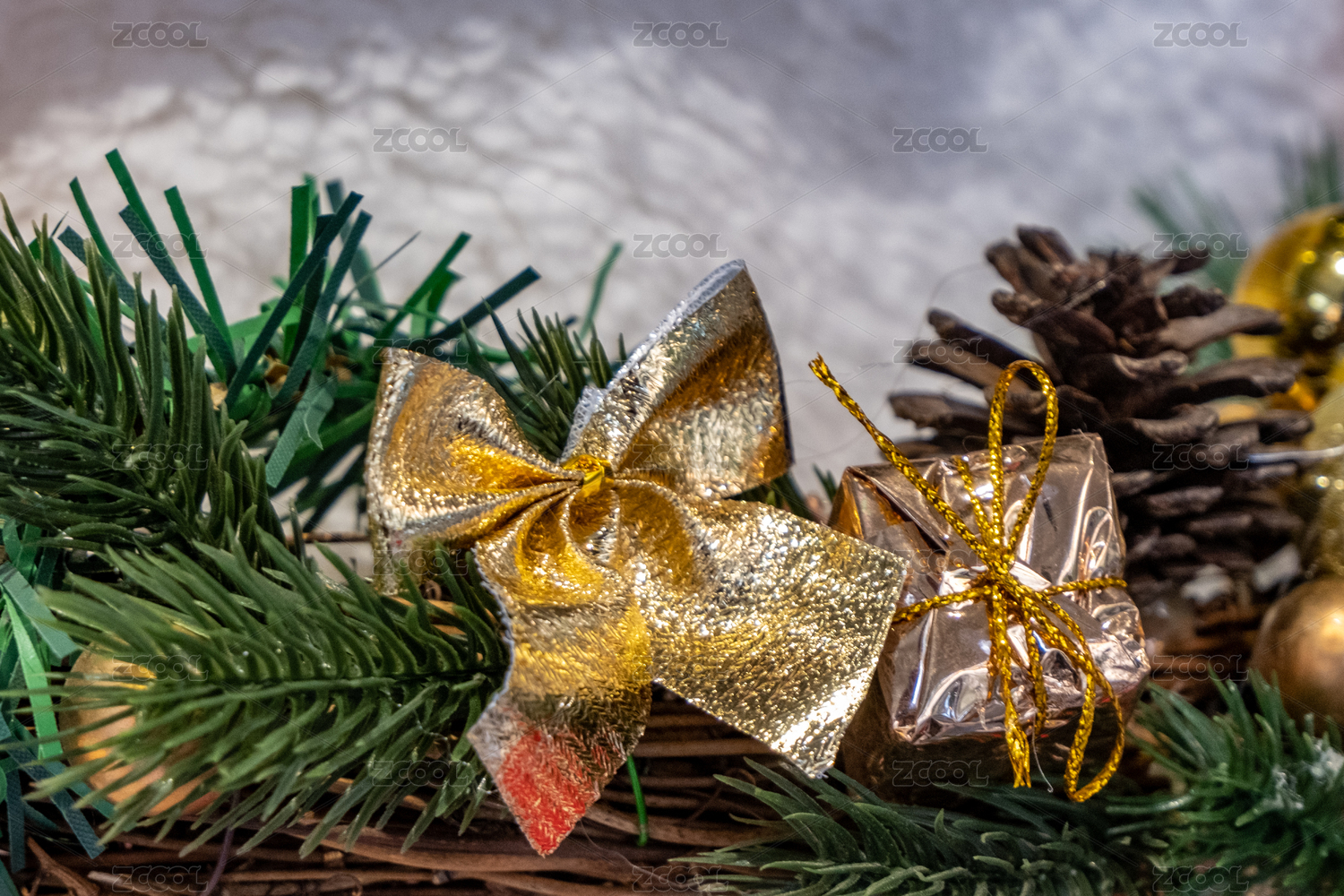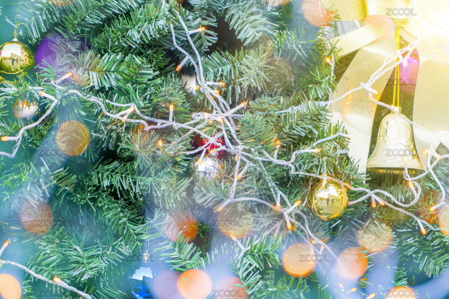 圣诞节里的挂满圣诞礼物的松树局部特写节日素