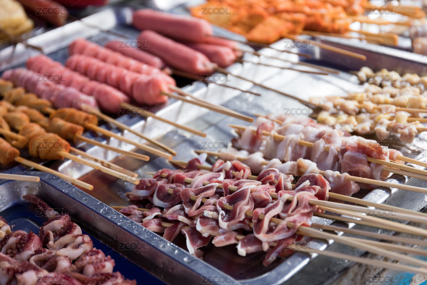 大排档上的各类烧烤肉串食材