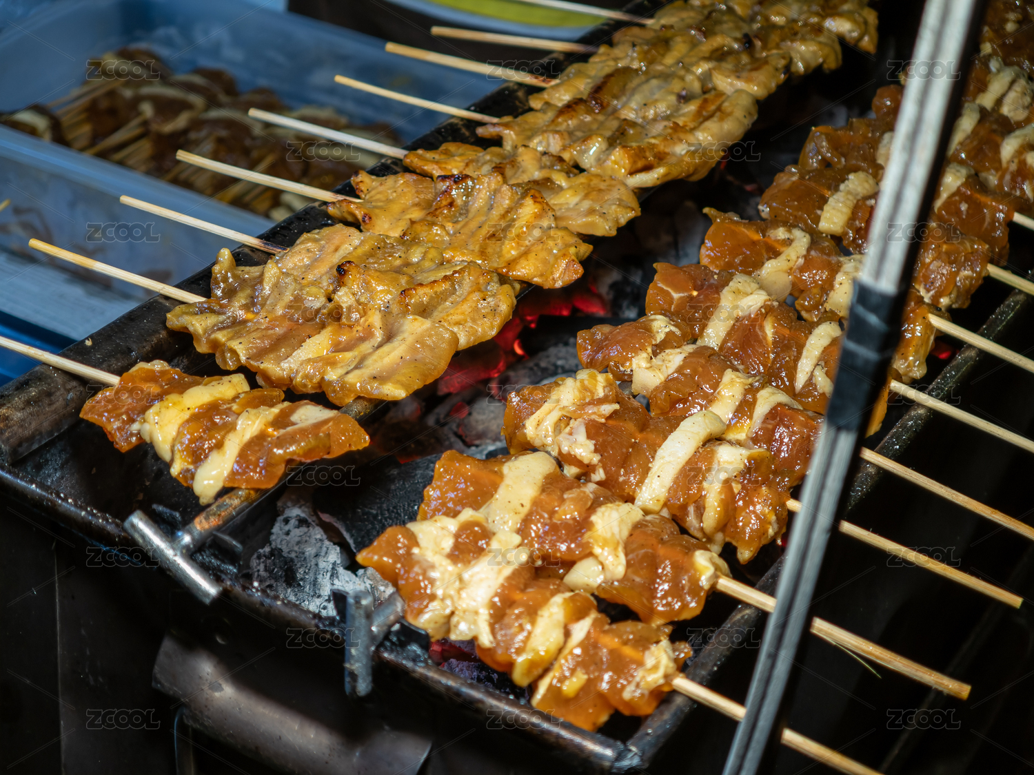 泰国清迈街头烧烤架上烤制的肉串