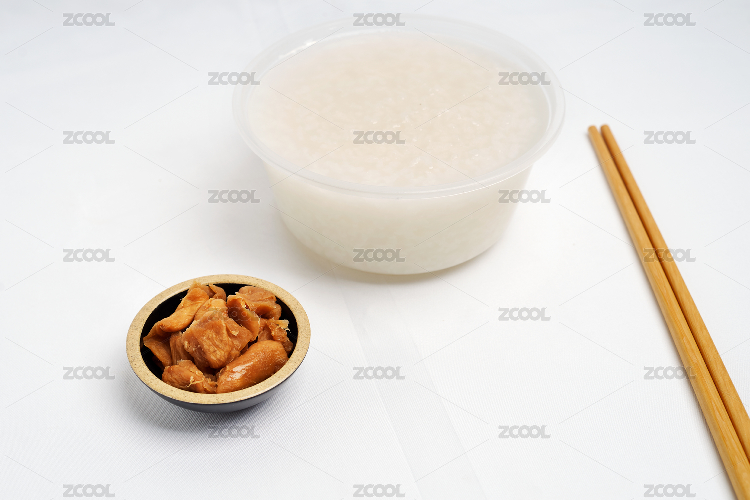 白色桌面上的中国广东风味美食——一碗白粥和一碟萝卜干