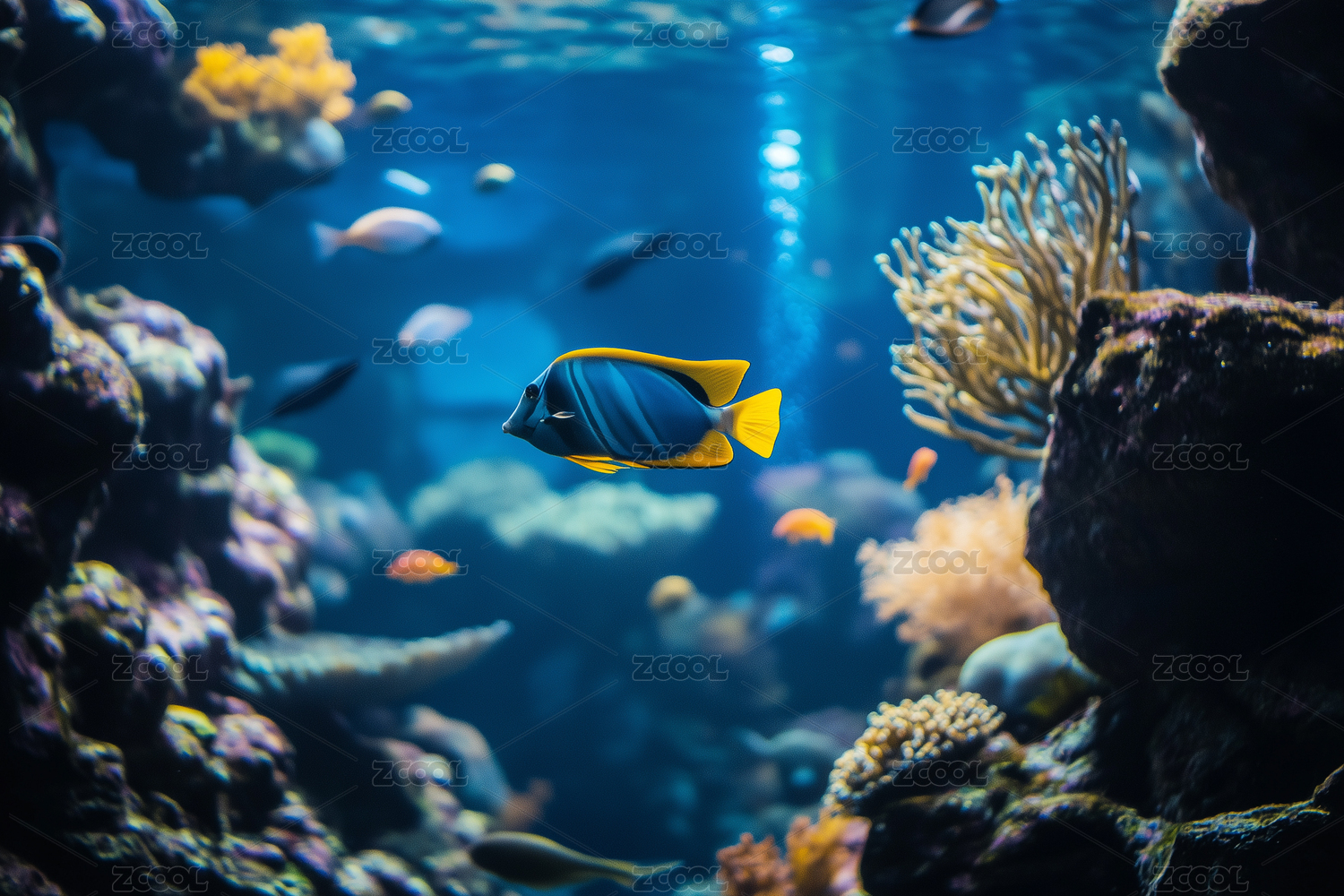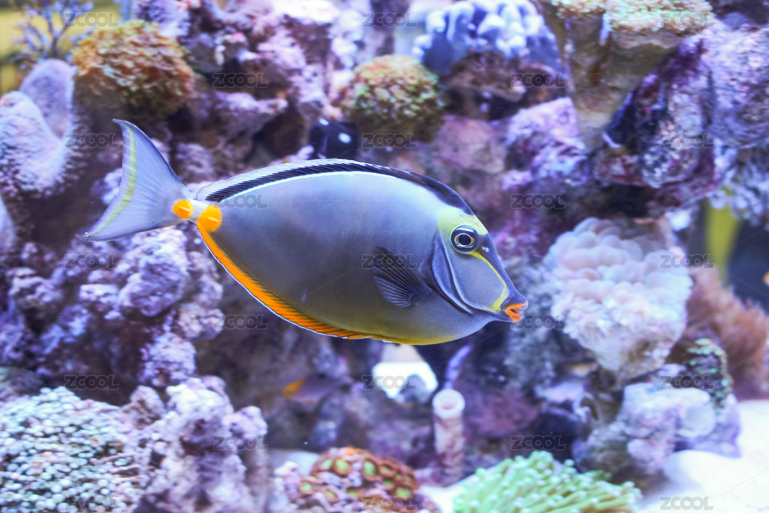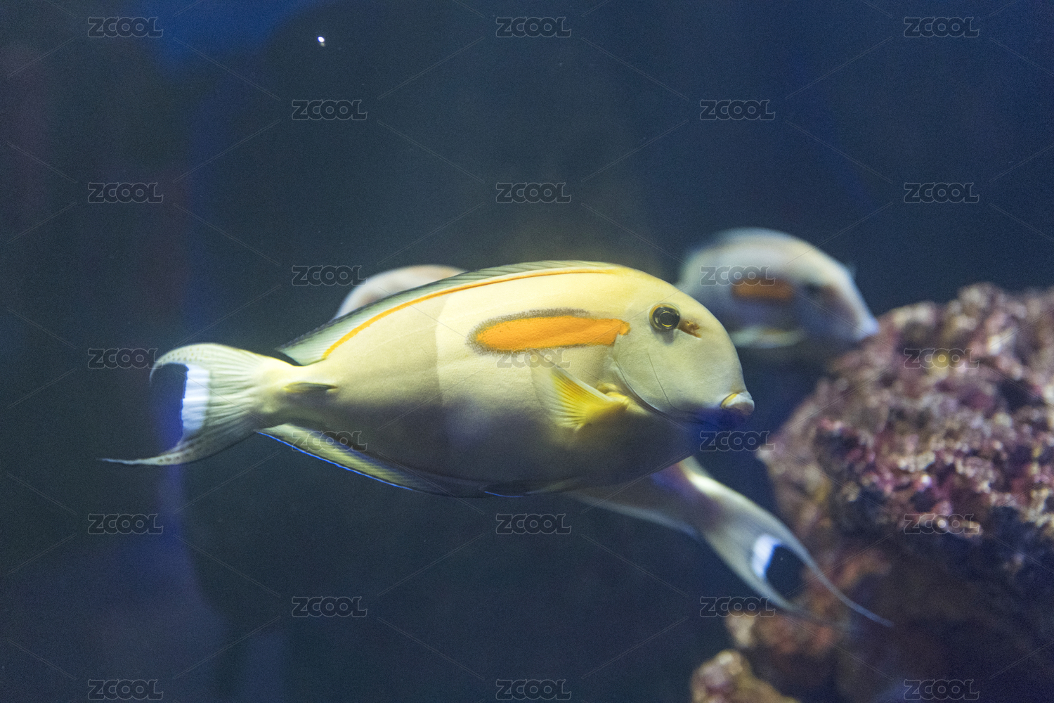 正在游动的蓝色身体带有深色花纹的蓝唐王鱼