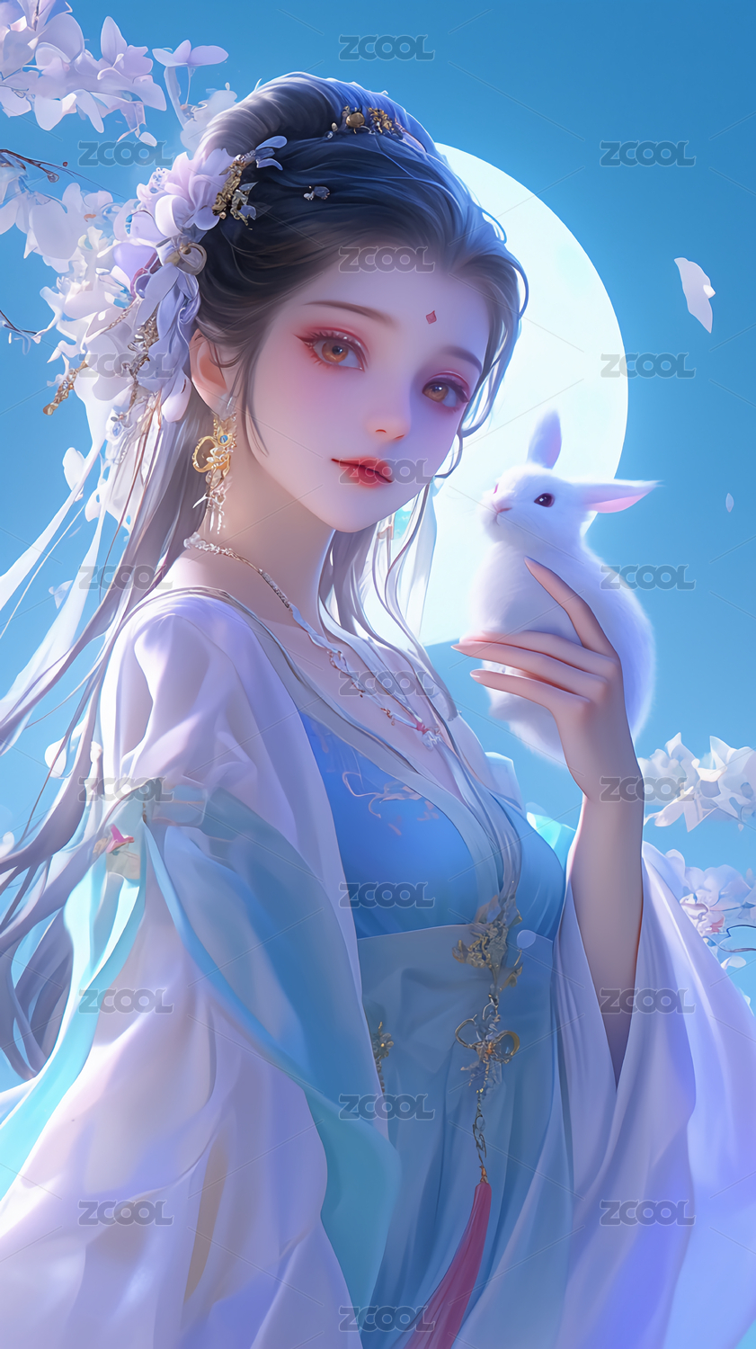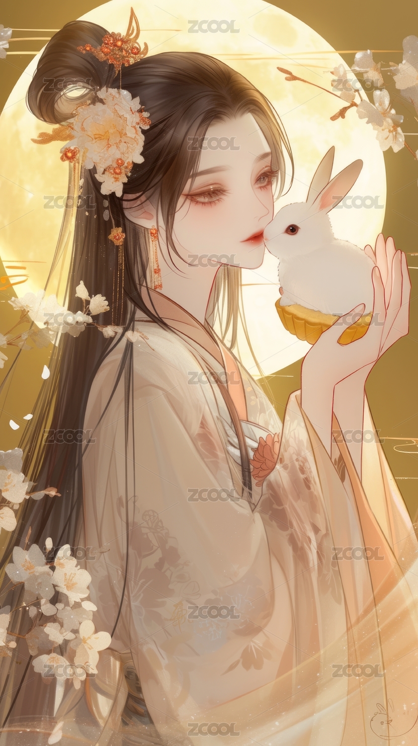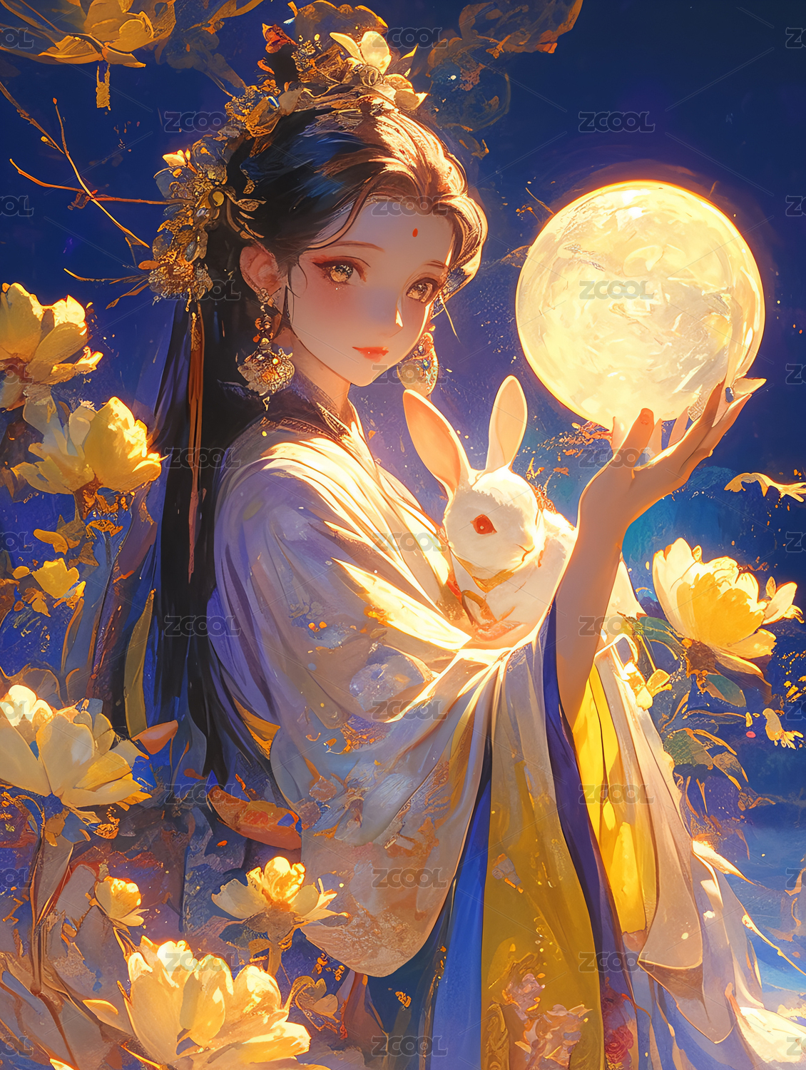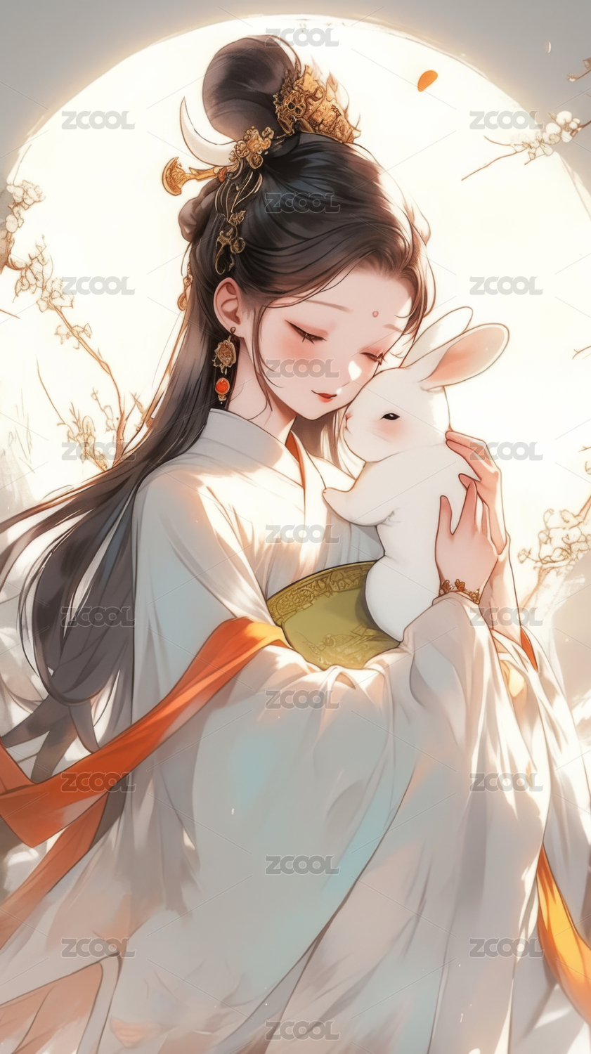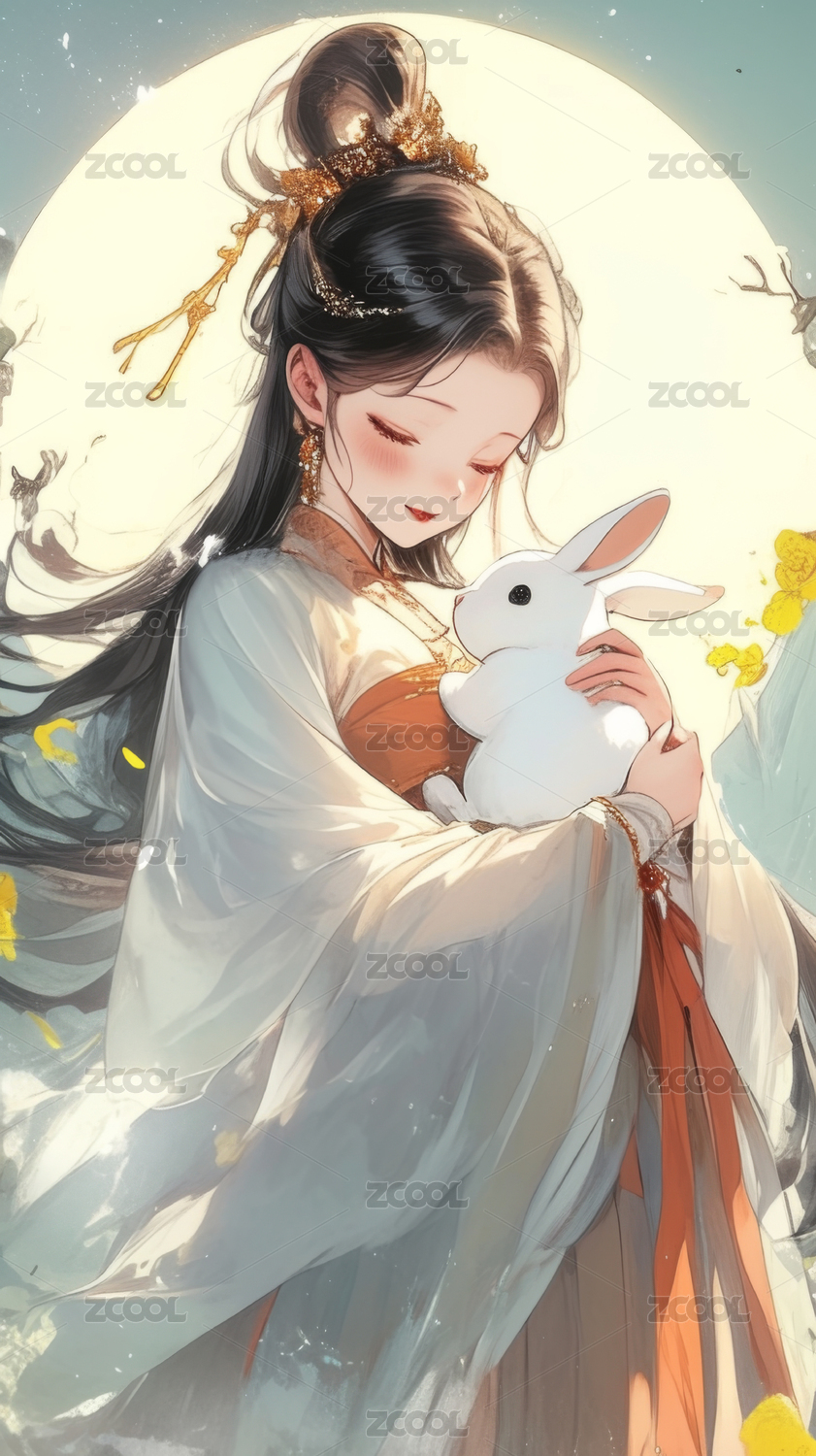 插画,神话人物,嫦娥,玉兔,中秋节,月亮,女孩,角色,兔子,古装