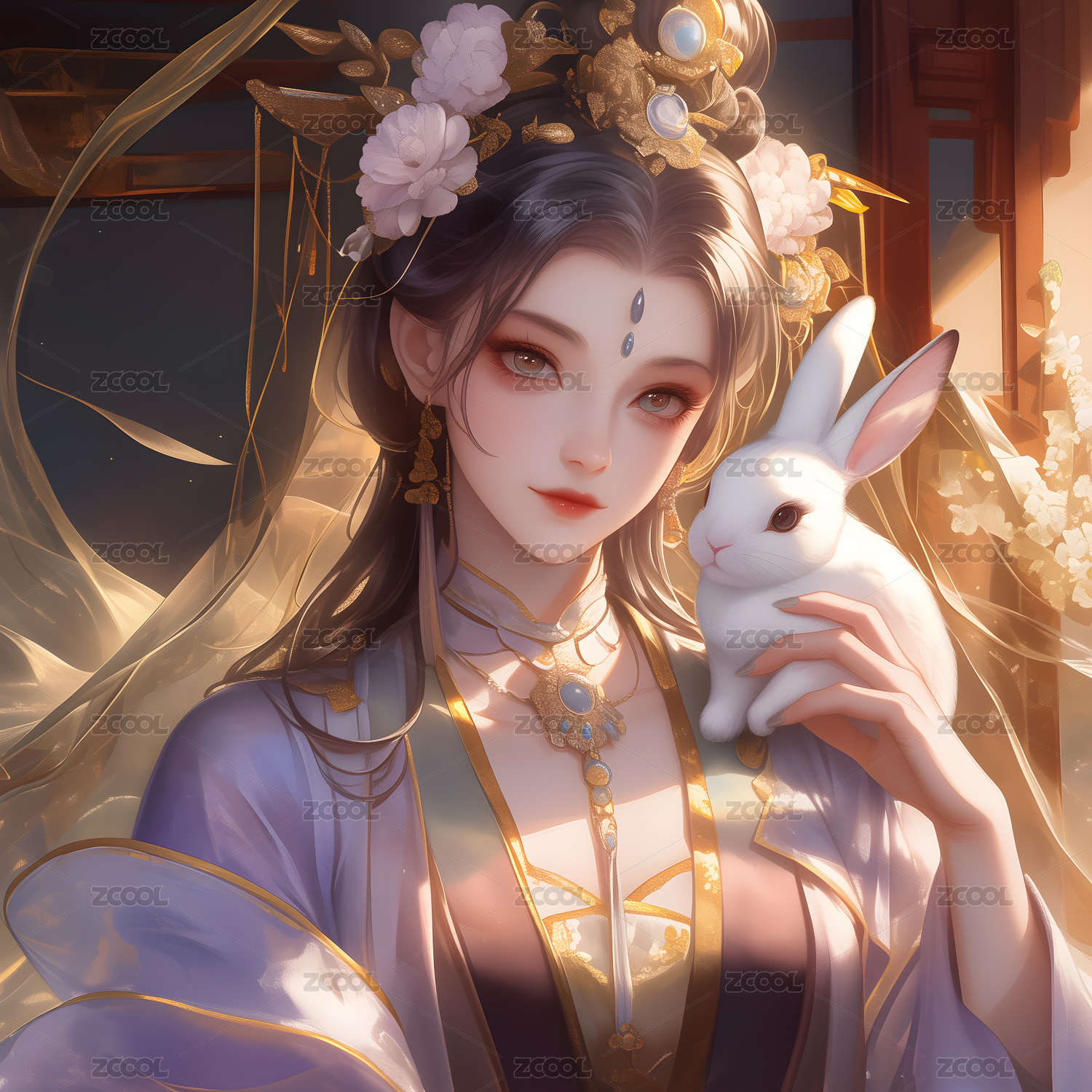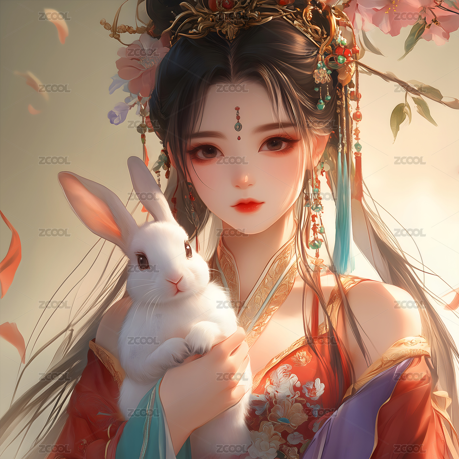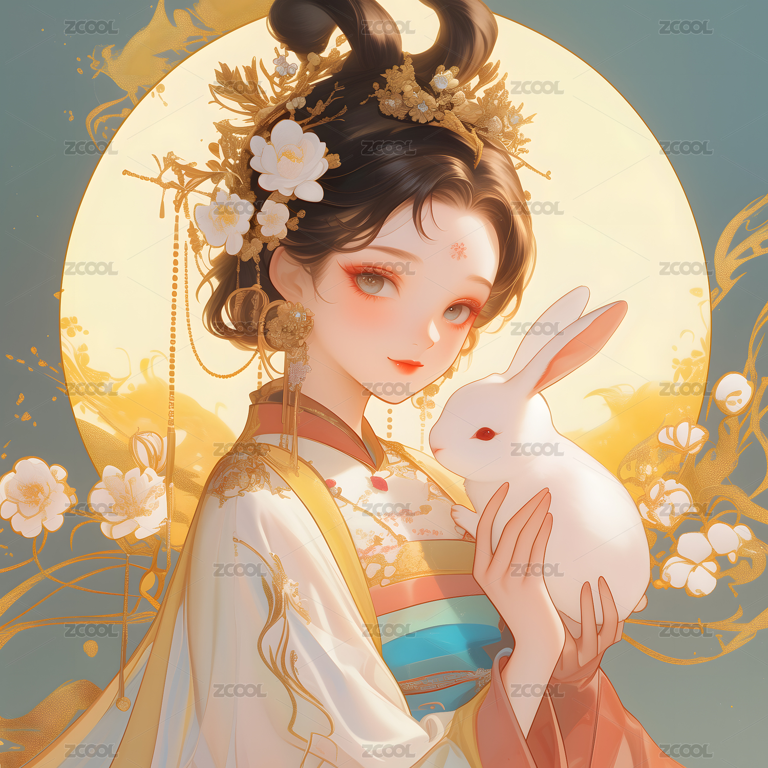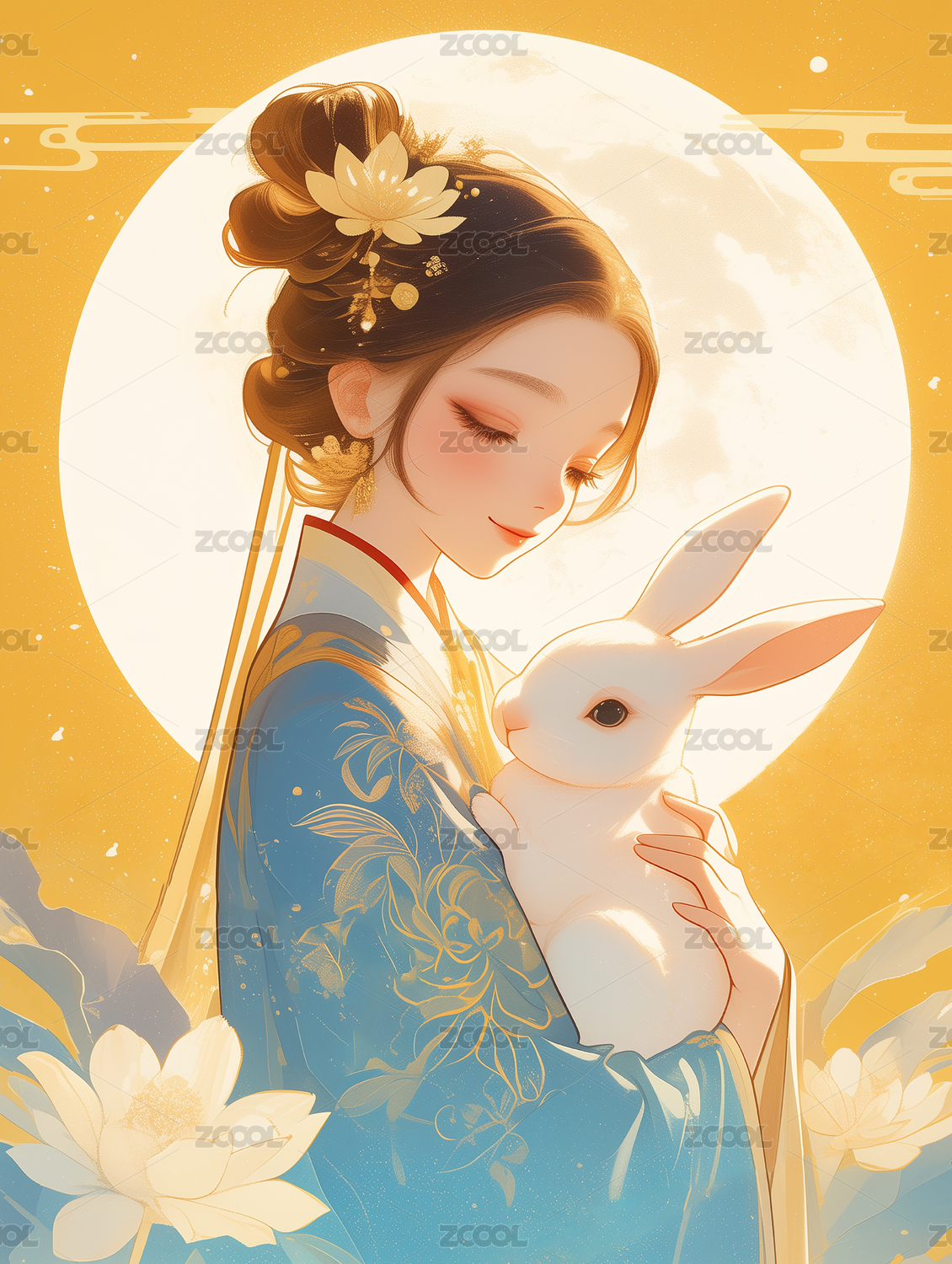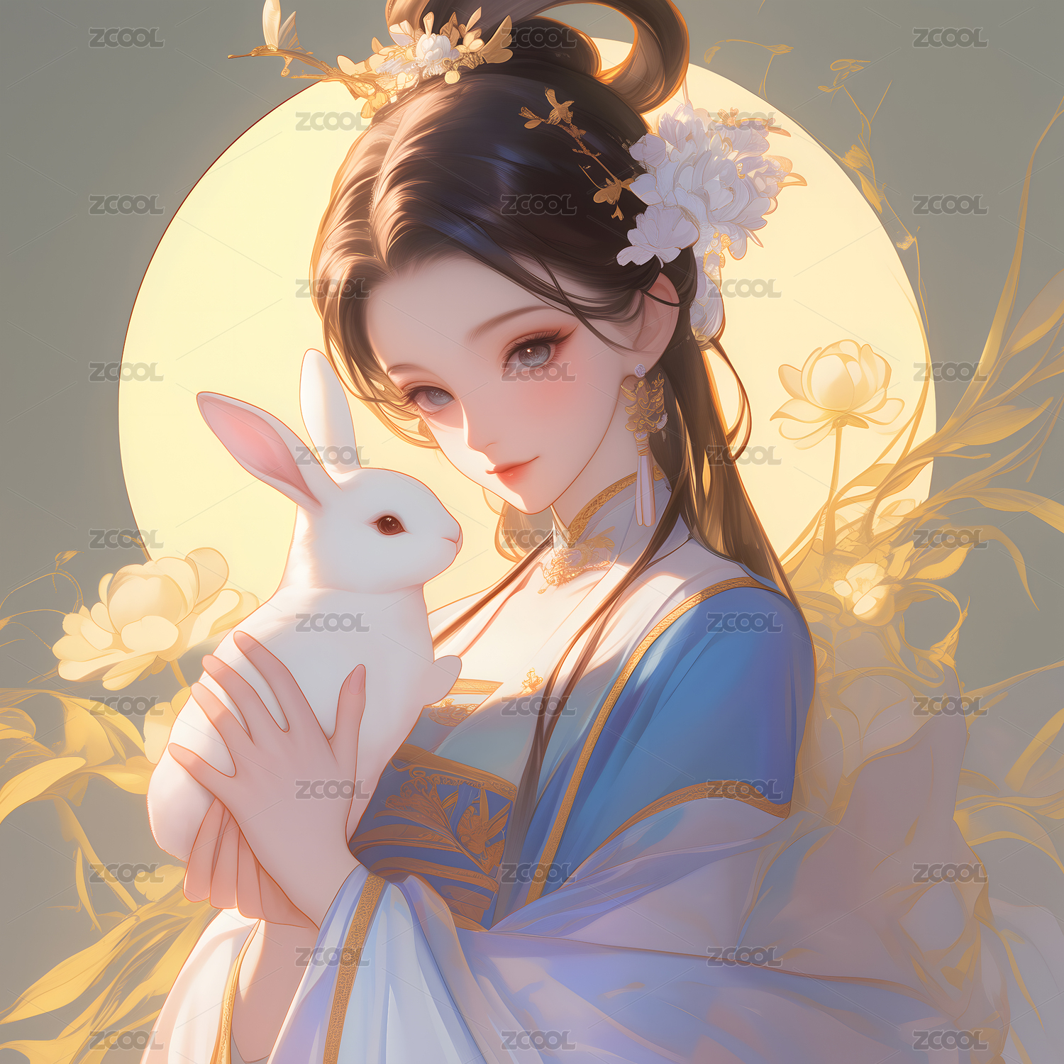 插画,神话人物,嫦娥,玉兔,中秋节,月亮,女孩,角色,兔子,古装