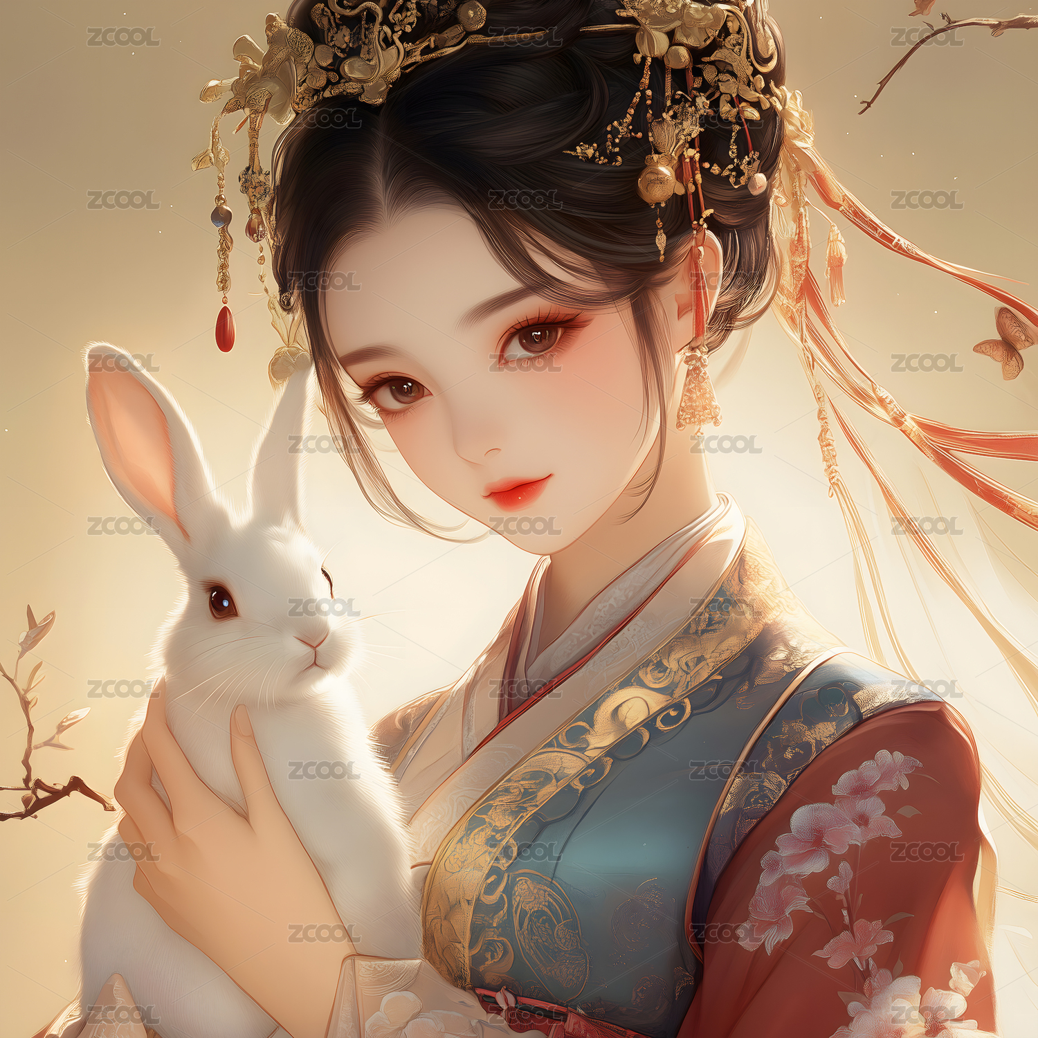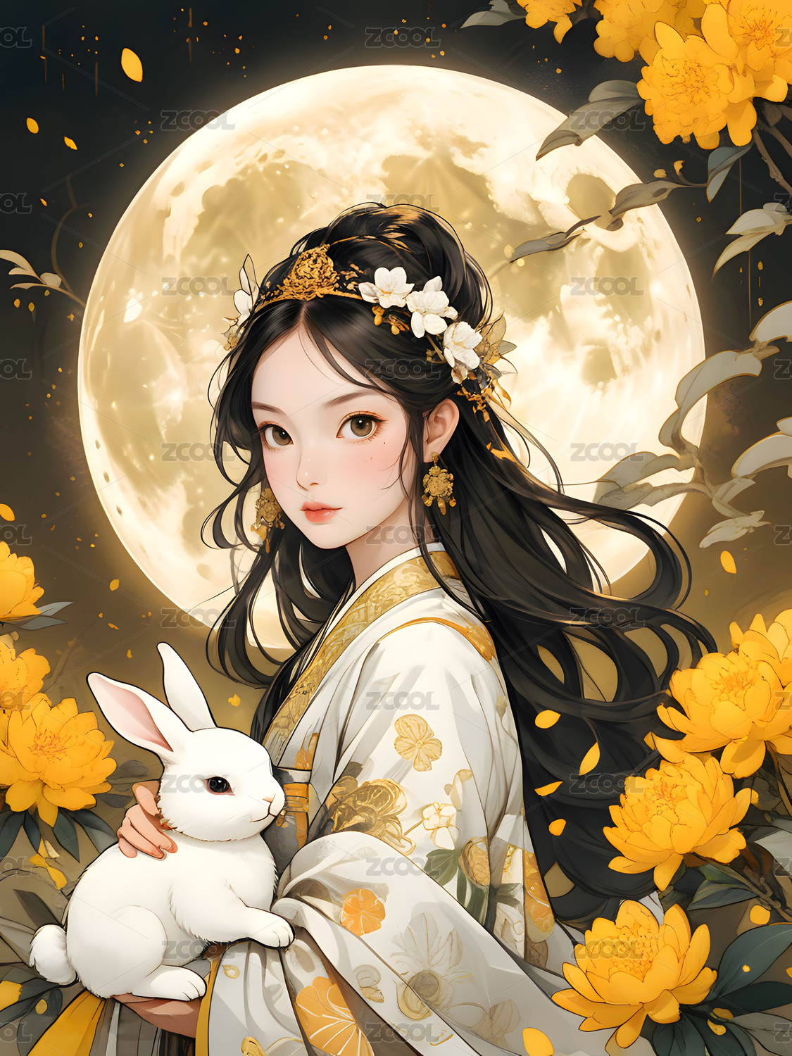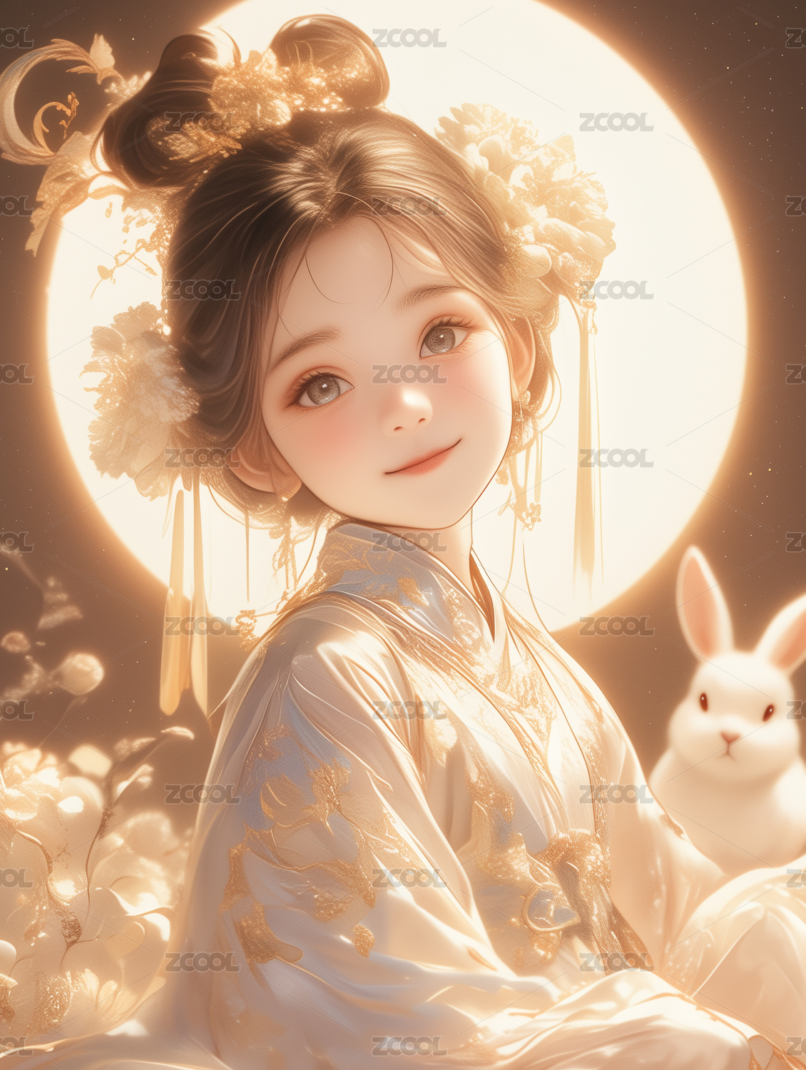 穿汉服的女孩和可爱的兔子背景一轮明月