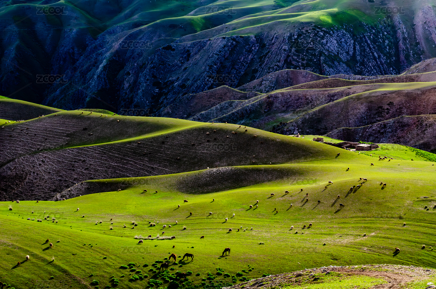 夏天绿色的中国新疆伊犁阿克塔斯草原