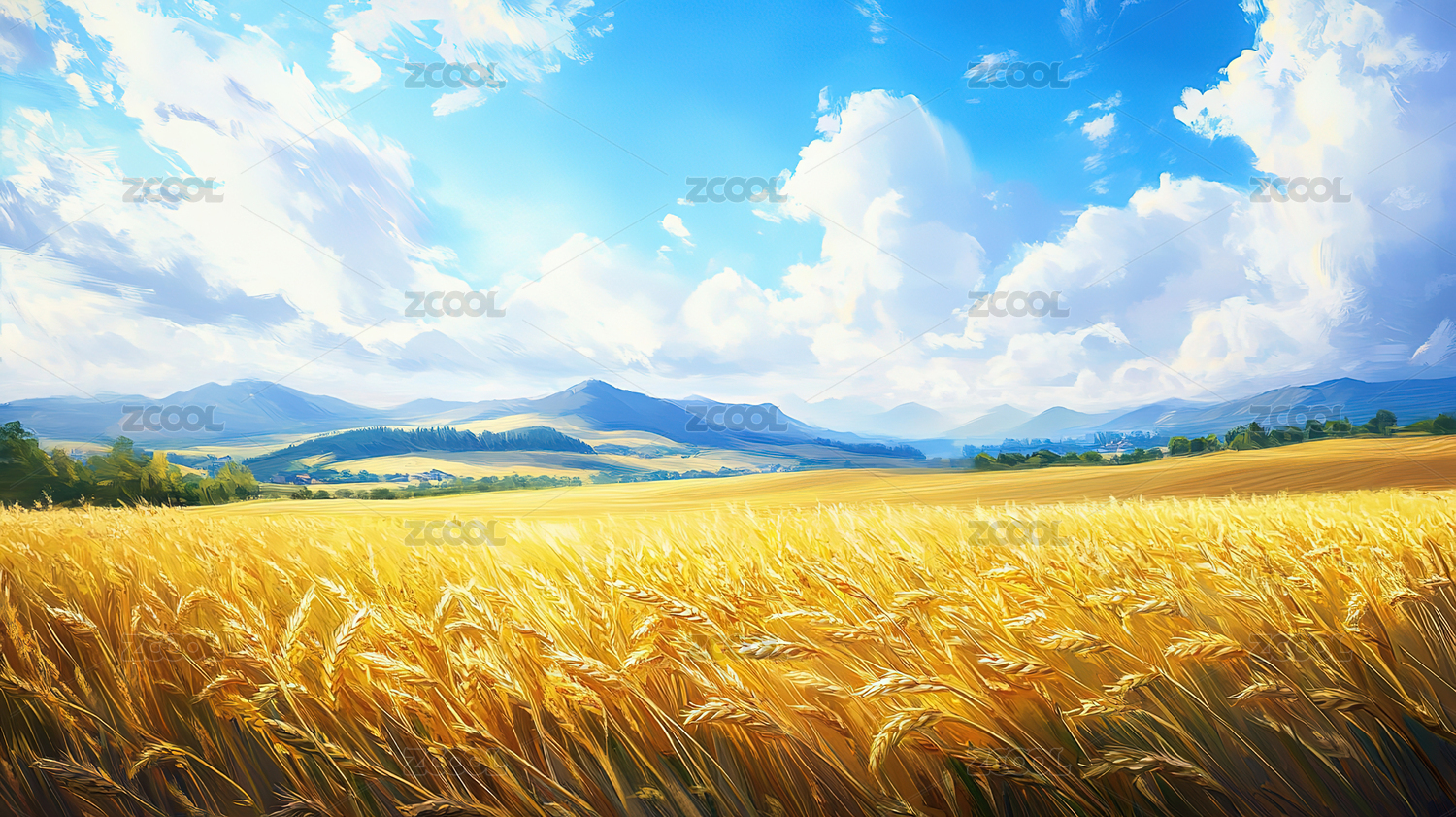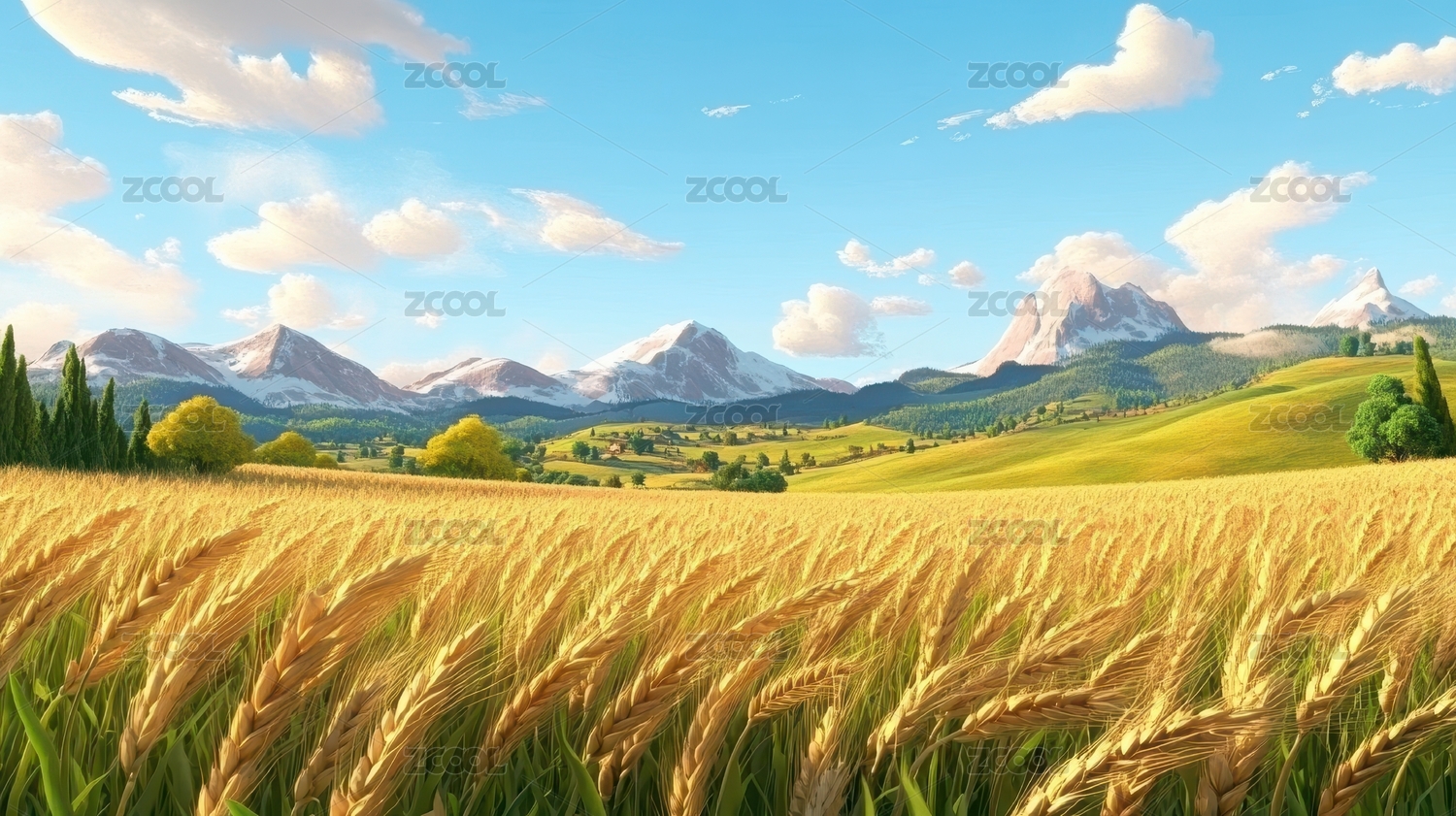 麦田,金黄,小屋,蓝天,白云,阳光,树木,山丘,土路,自然