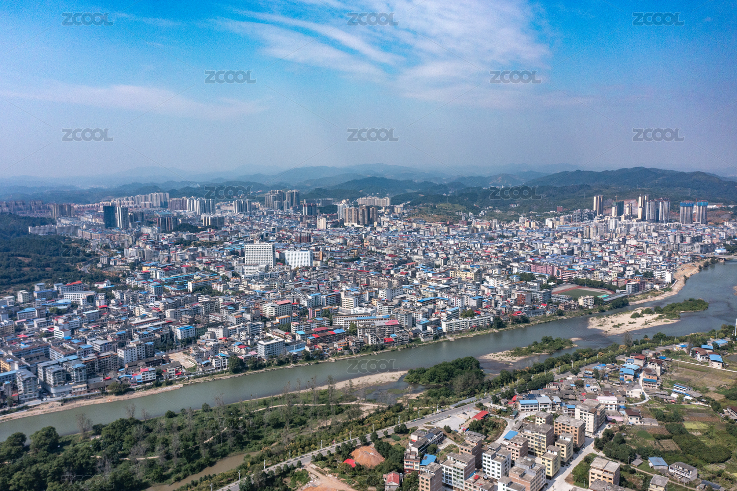 晴好天气下俯拍福建长汀汀江两岸的民居