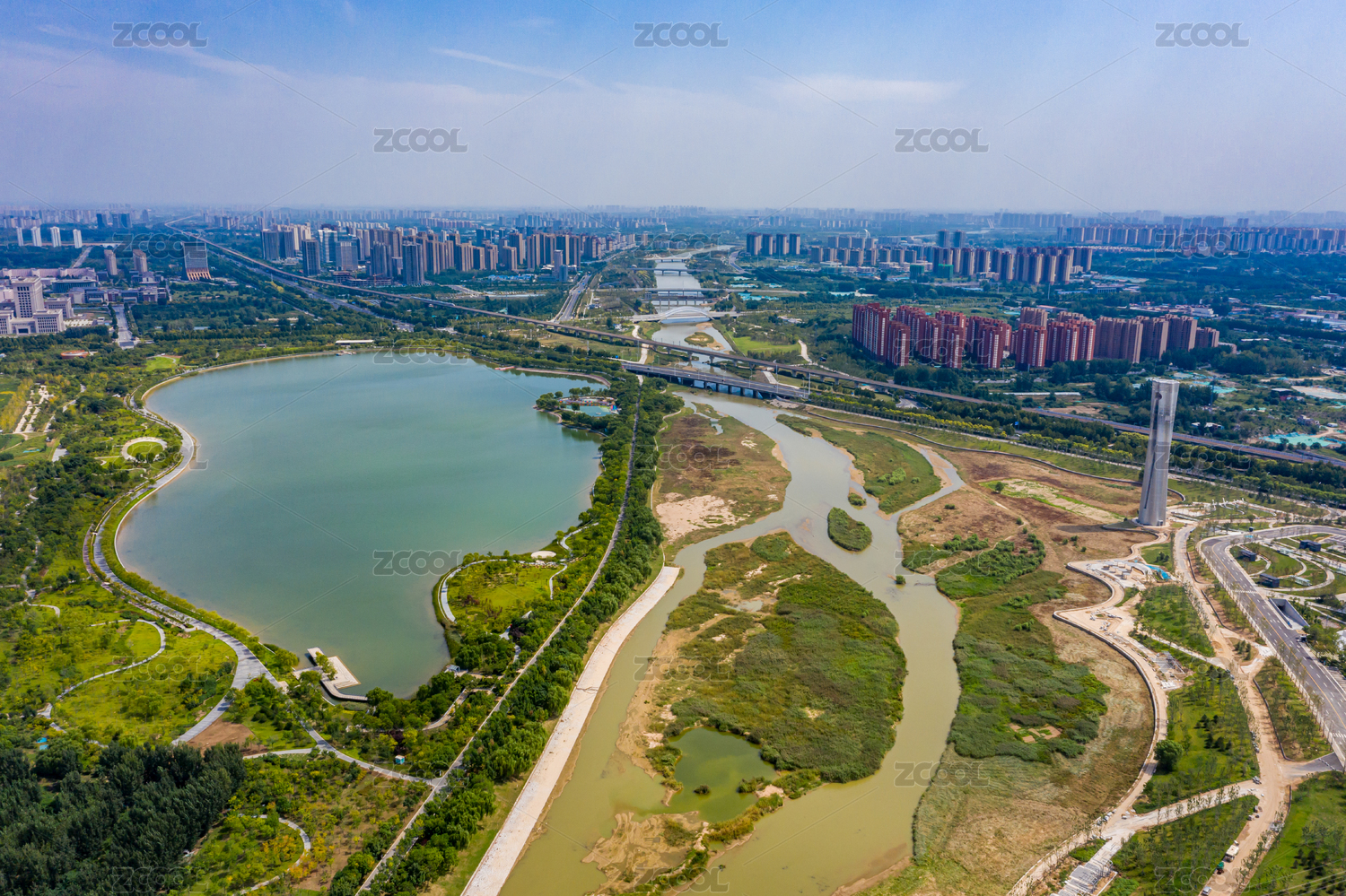航拍河南郑州象湖生态湿地公园及贾鲁河水系