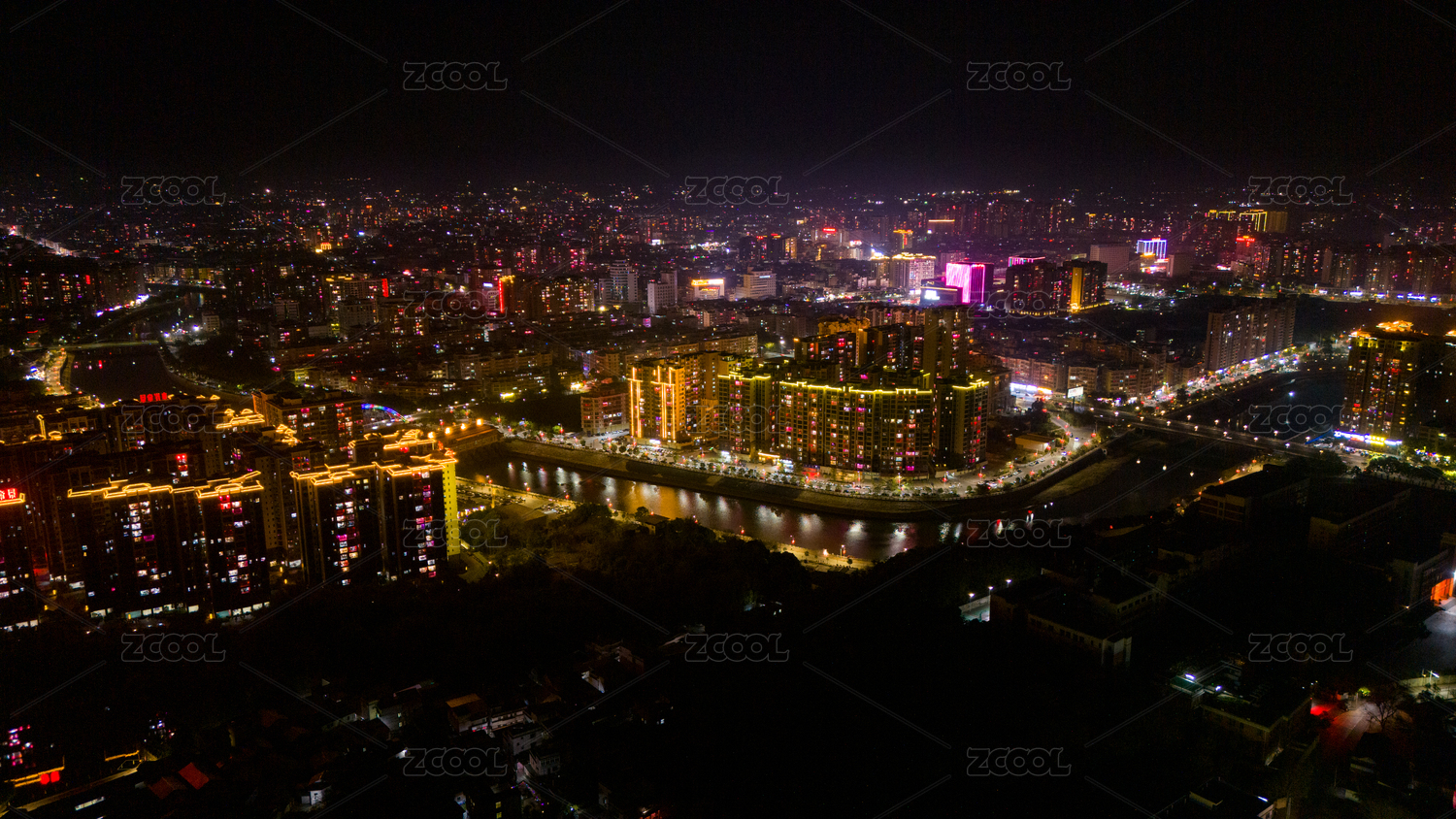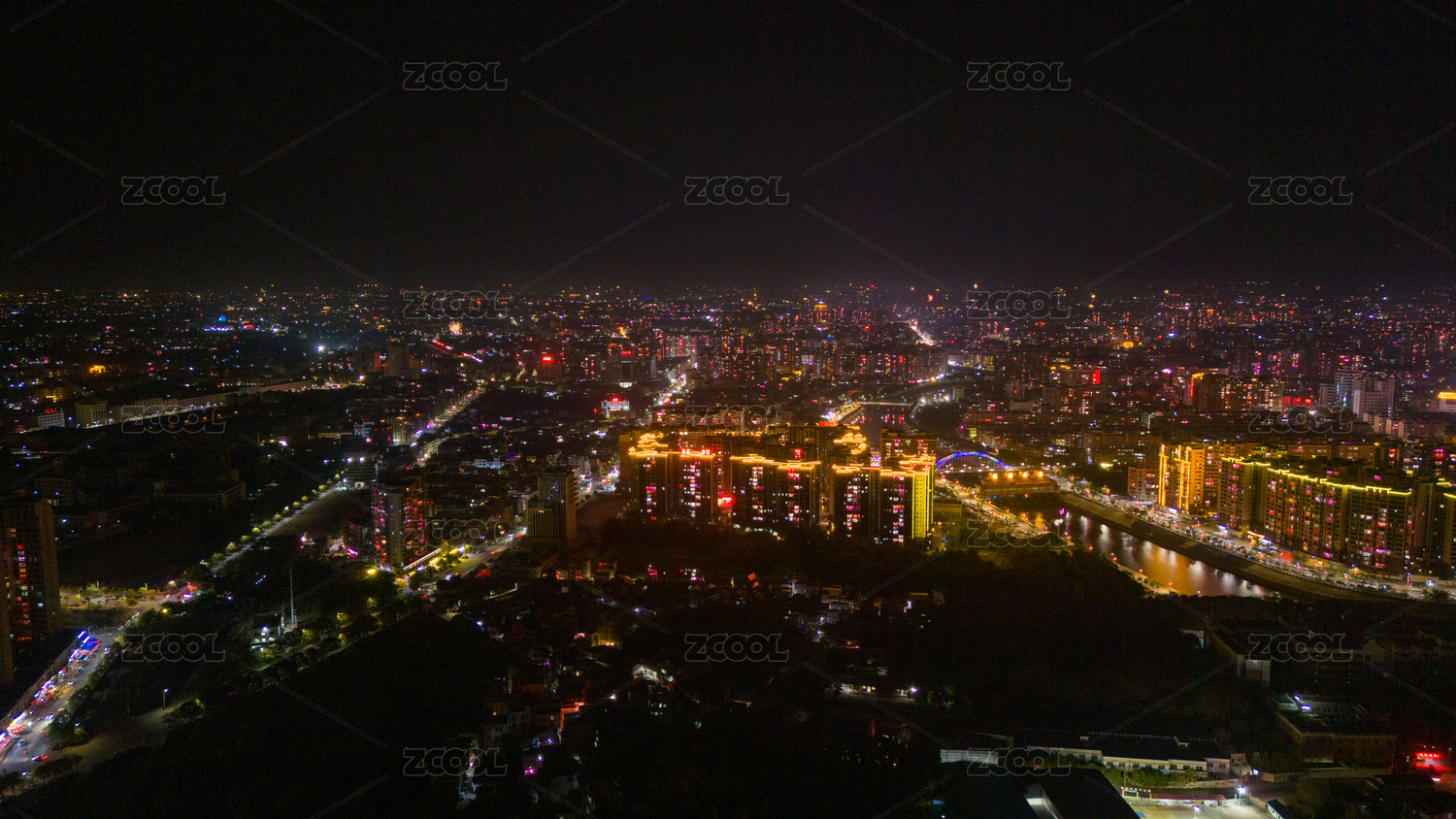 航拍广东梅州兴宁春节城市灯火与现代化建筑