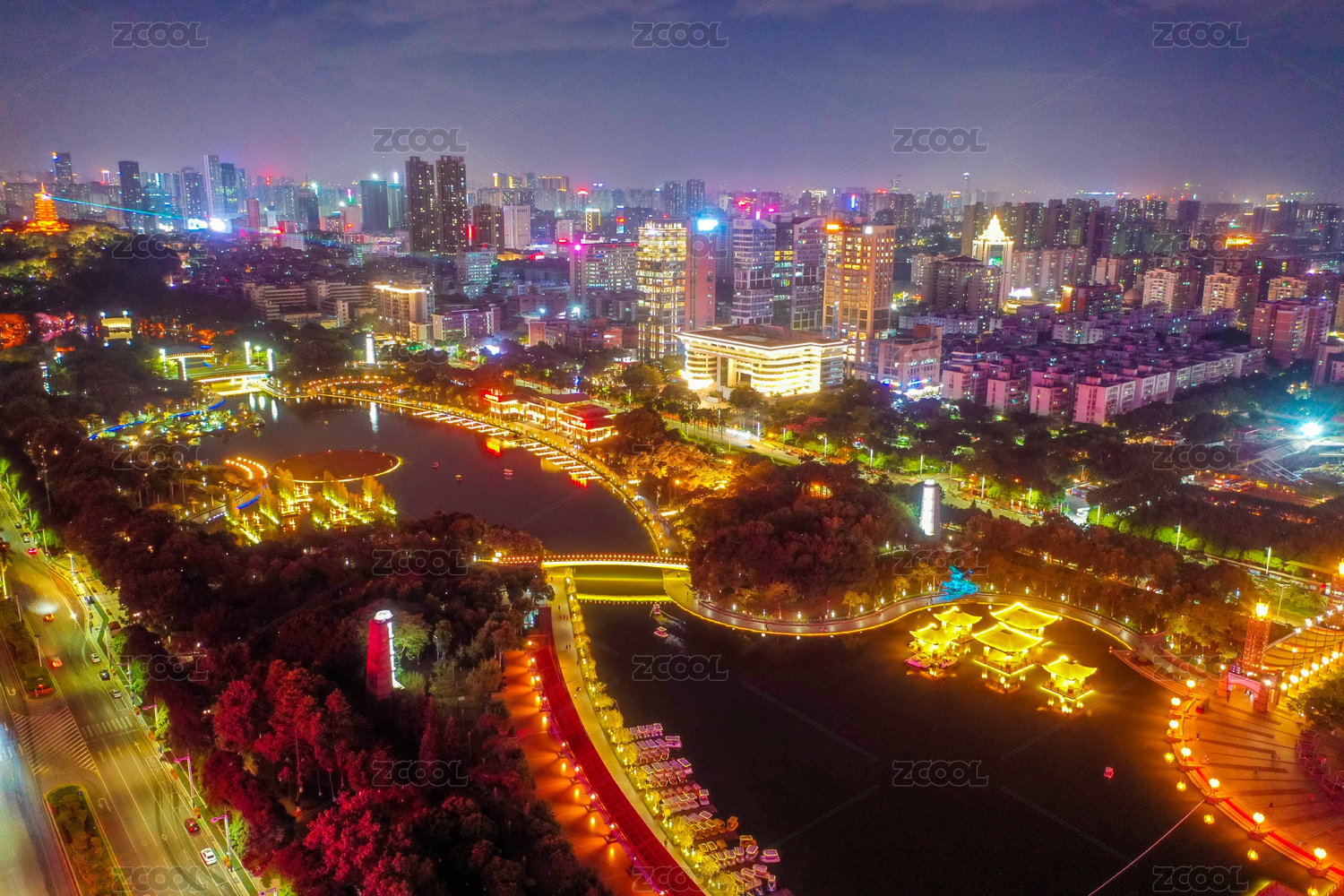 中国江苏扬州明月湖夜景航拍