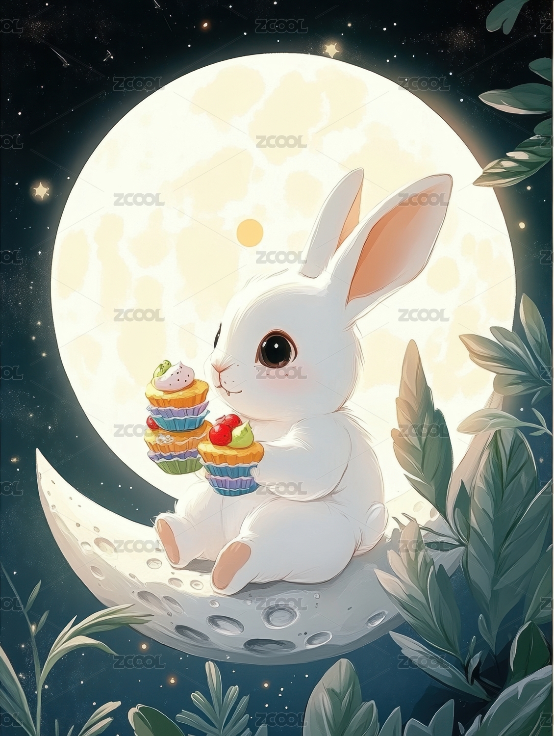AIGC202403,玉兔,3D,插画,中秋,节日,兔子,月亮,花卉