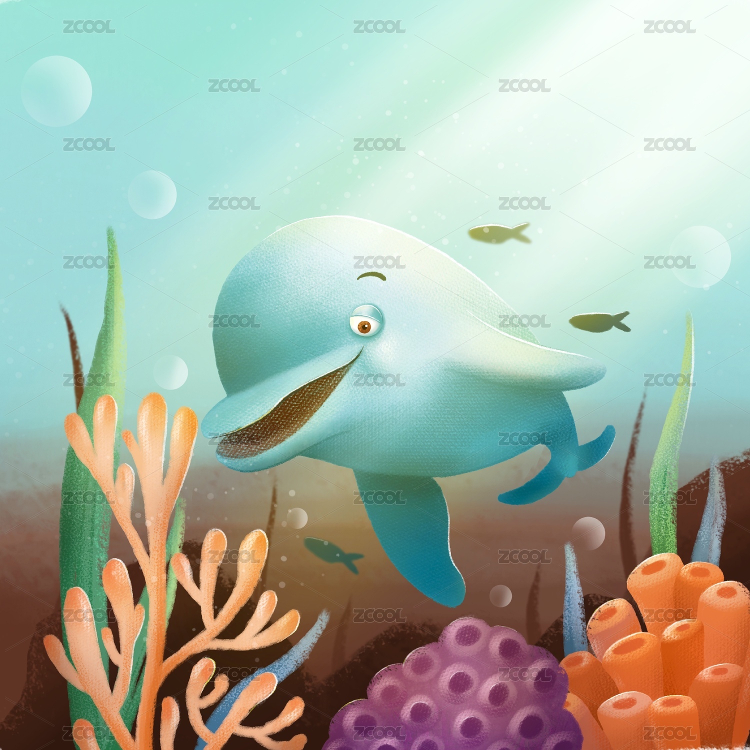 海底微笑的蓝色海豚和珊瑚水草