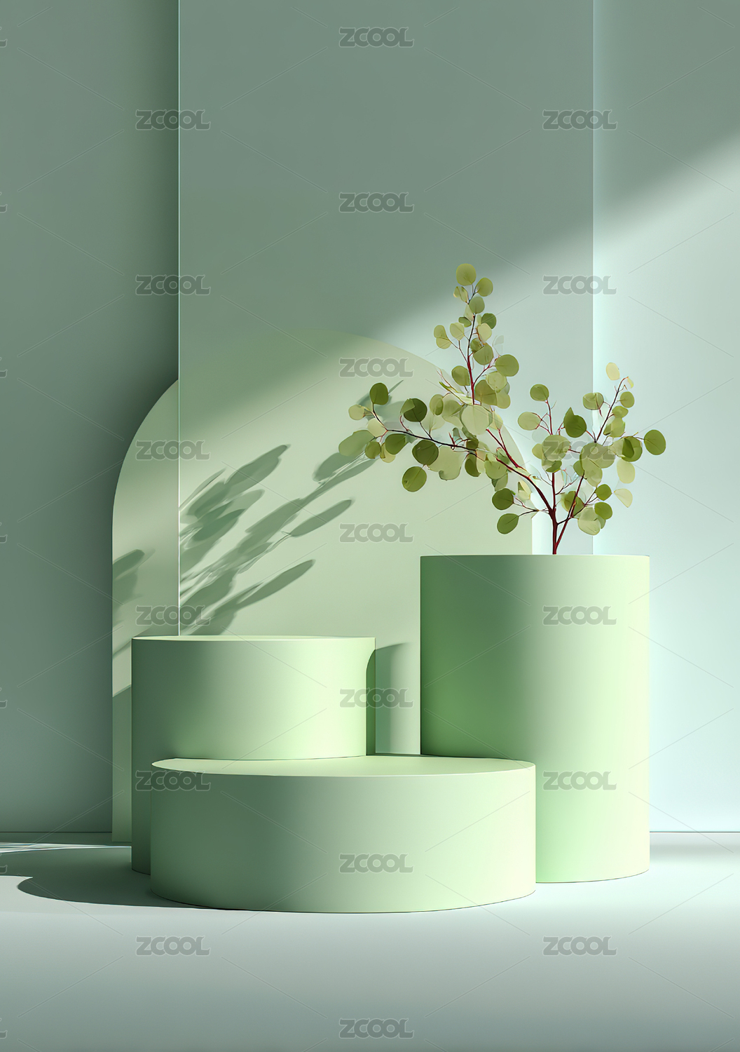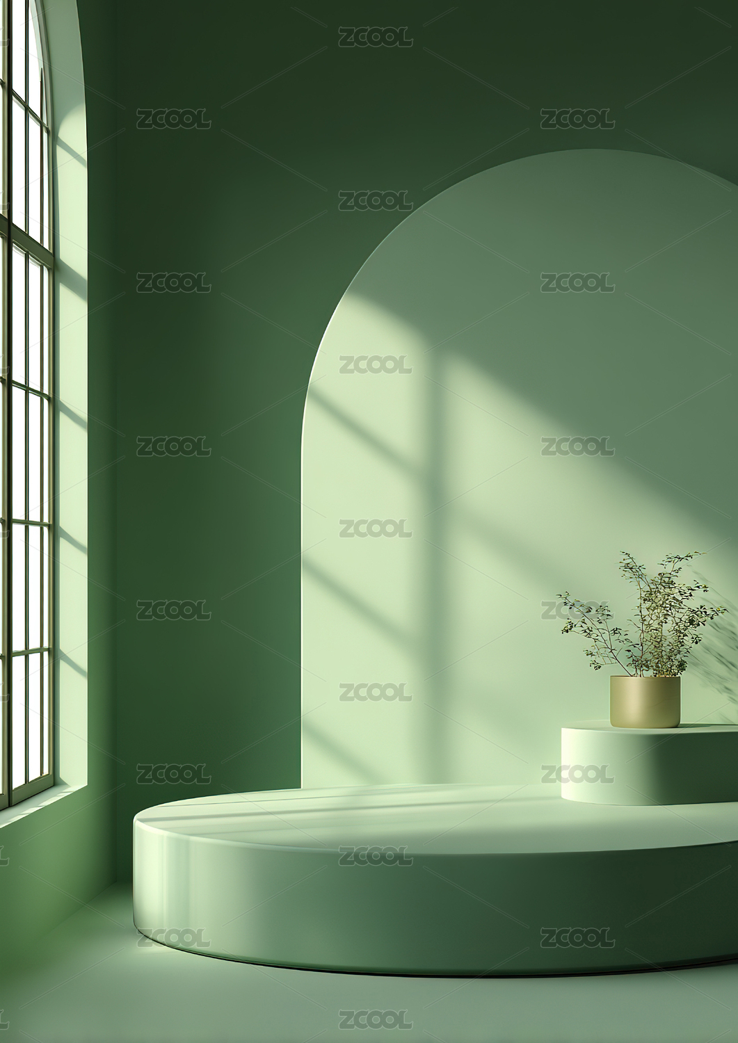 绿色室内空间圆形平台与拱窗设计