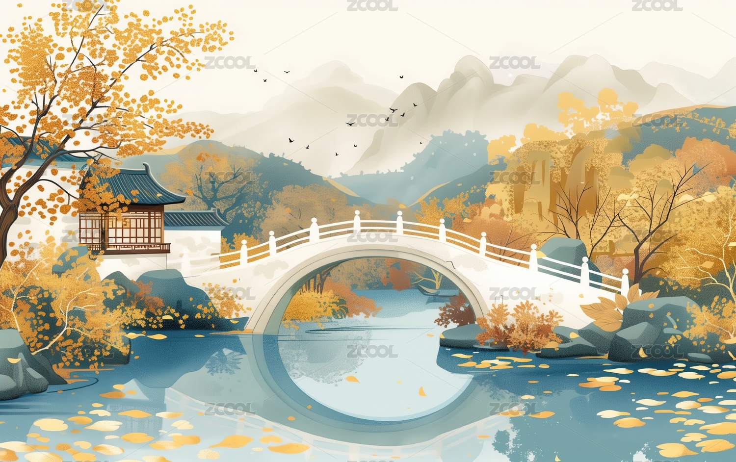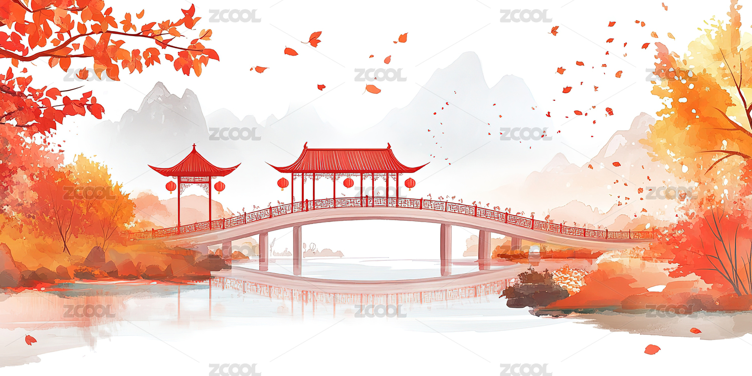 中式古桥河流风景插画
