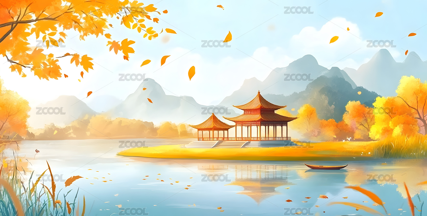 秋天古建筑风景插画