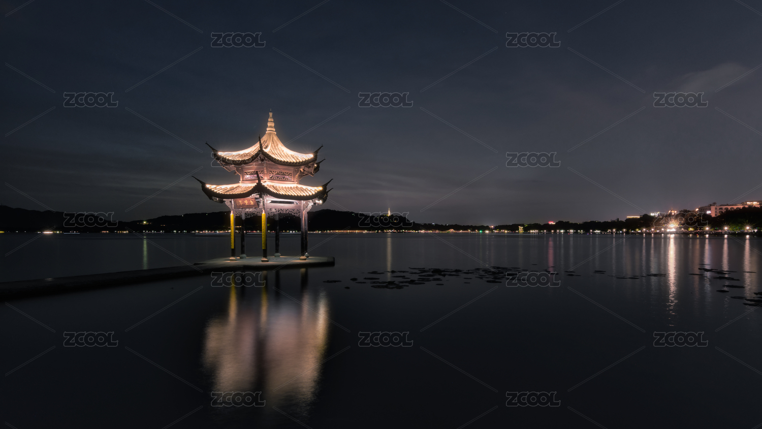 中国浙江杭州西湖夜景江南园林夜景集贤亭