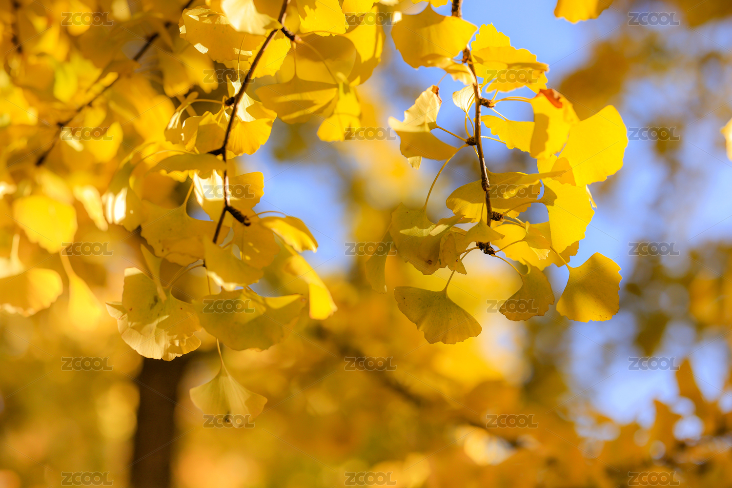 侧逆光条件下一枝金黄色的银杏叶片特写图