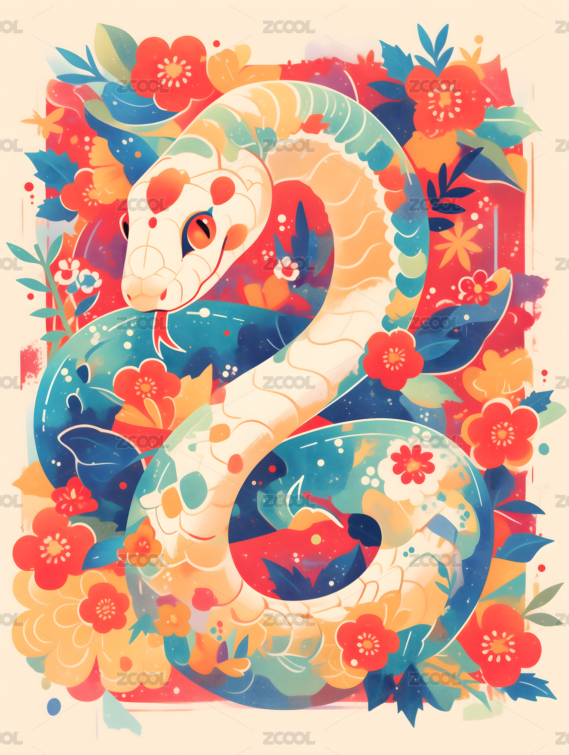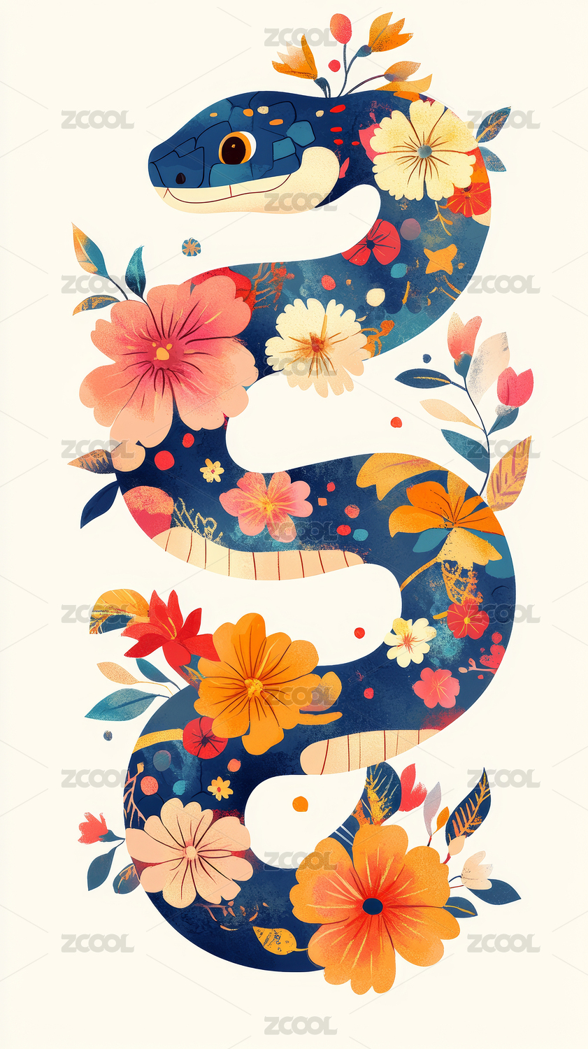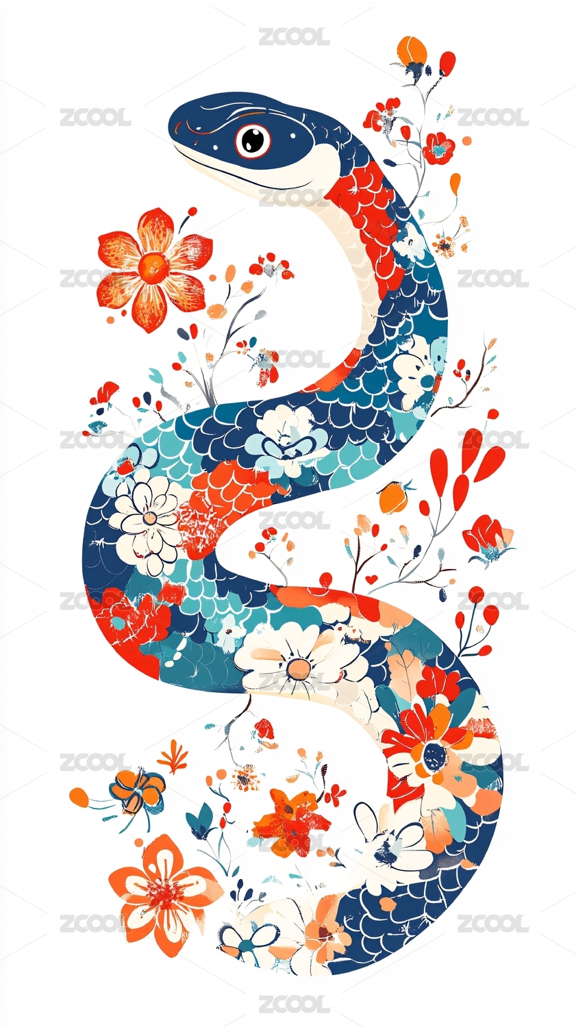 喜庆的复古风格五彩斑斓的蛇和花朵