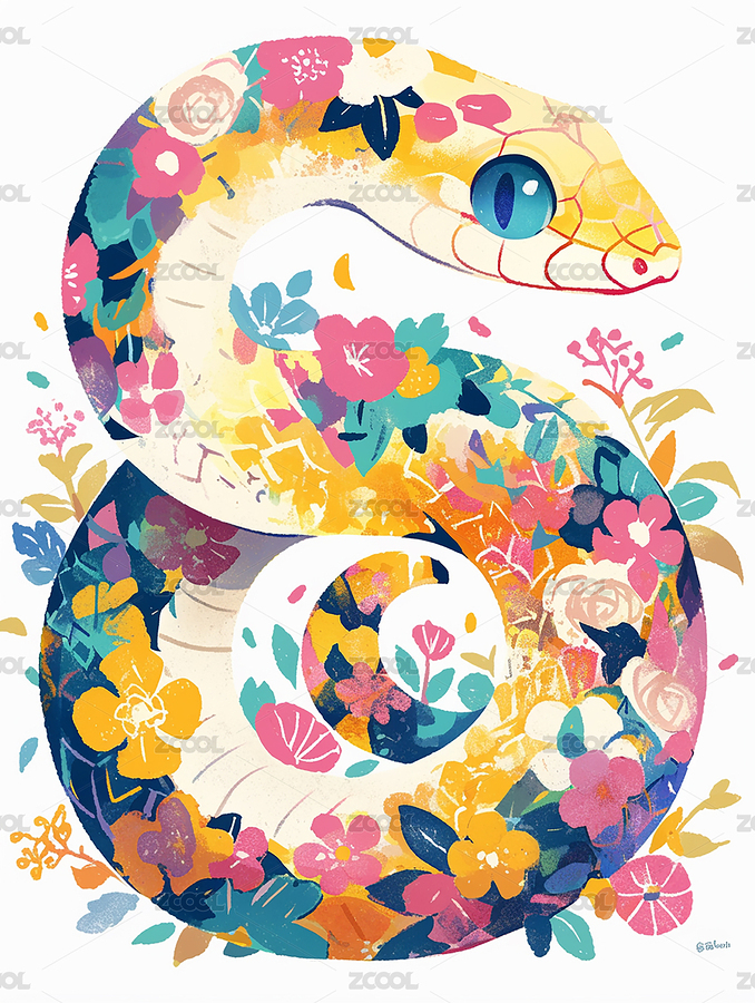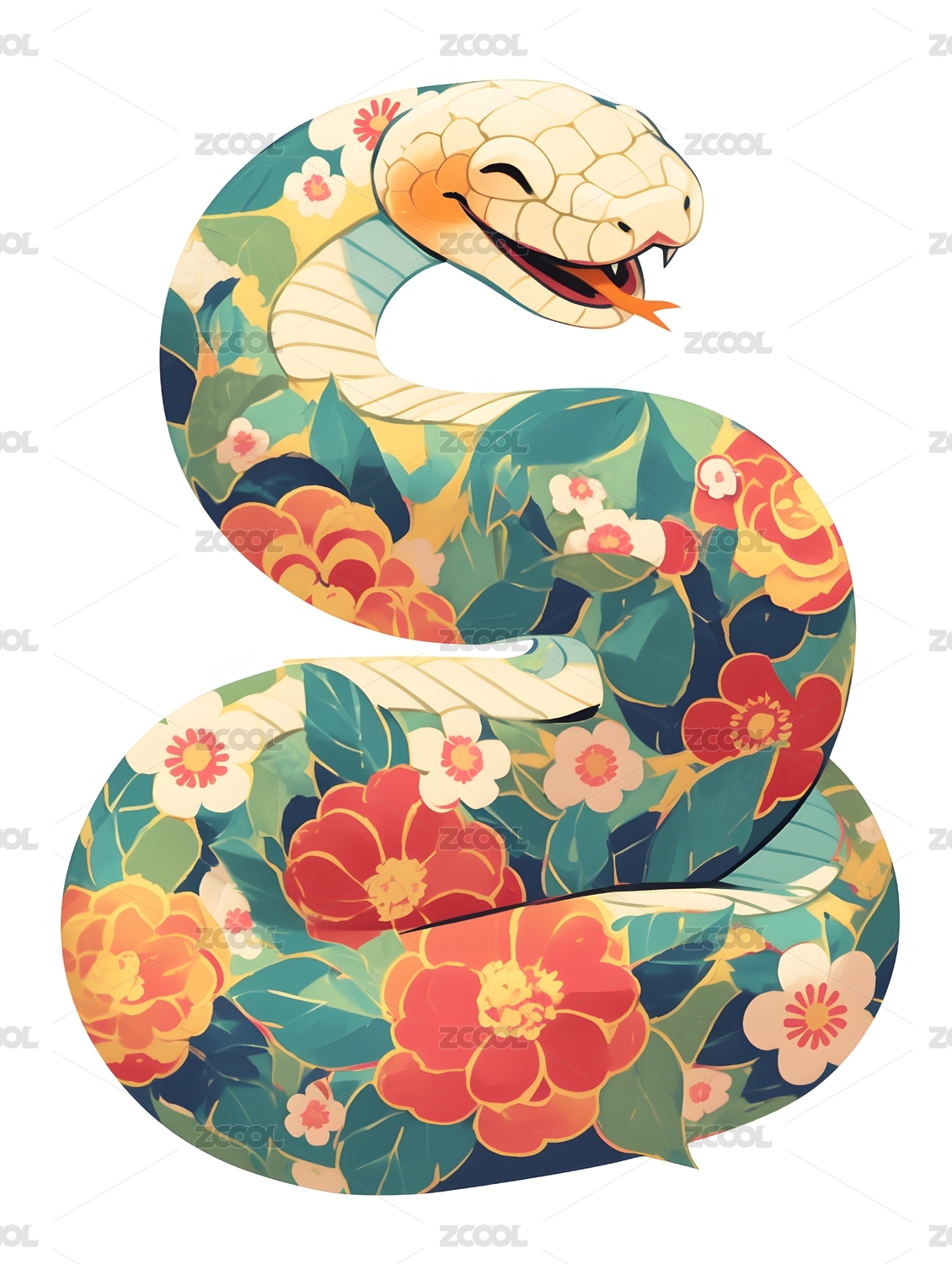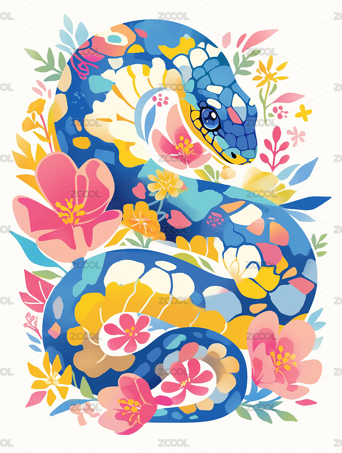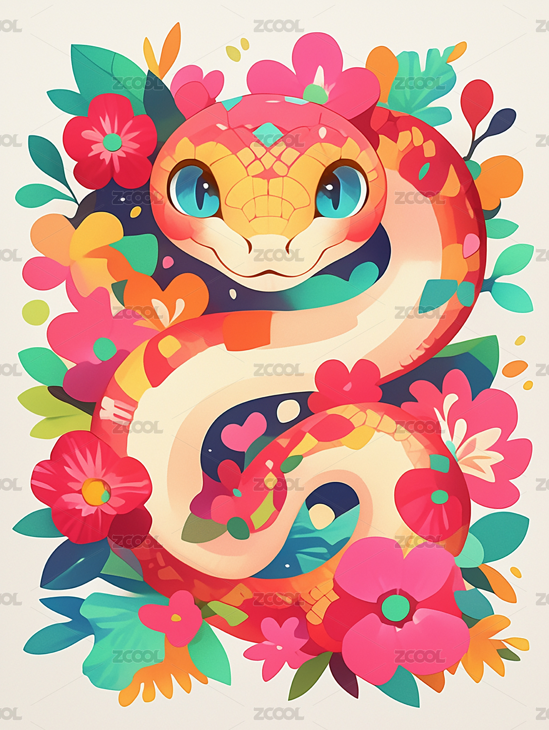 喜庆的复古风格五彩斑斓的蛇和花朵
