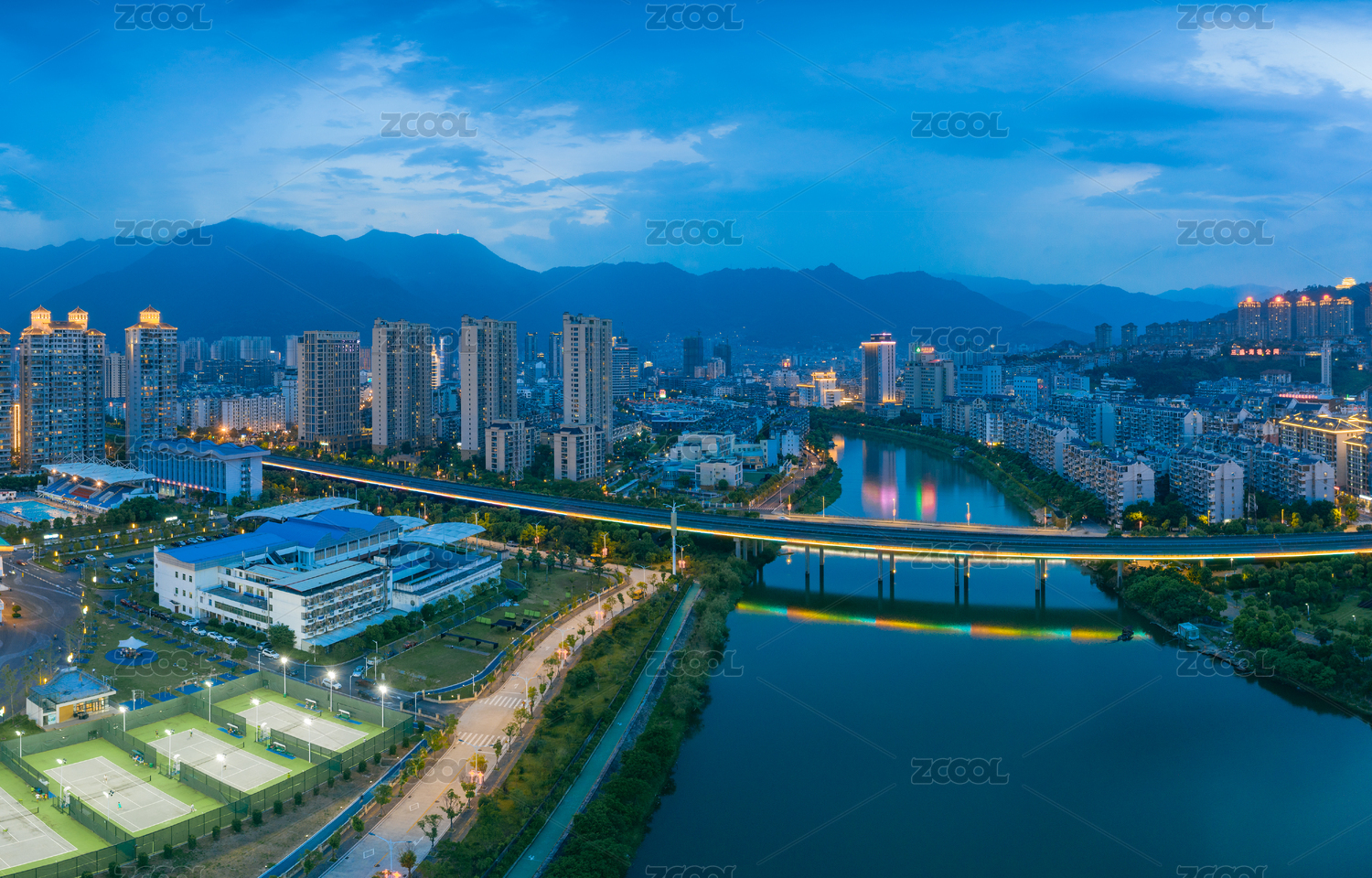 暮色下依山傍水的西双版纳多彩城市夜景