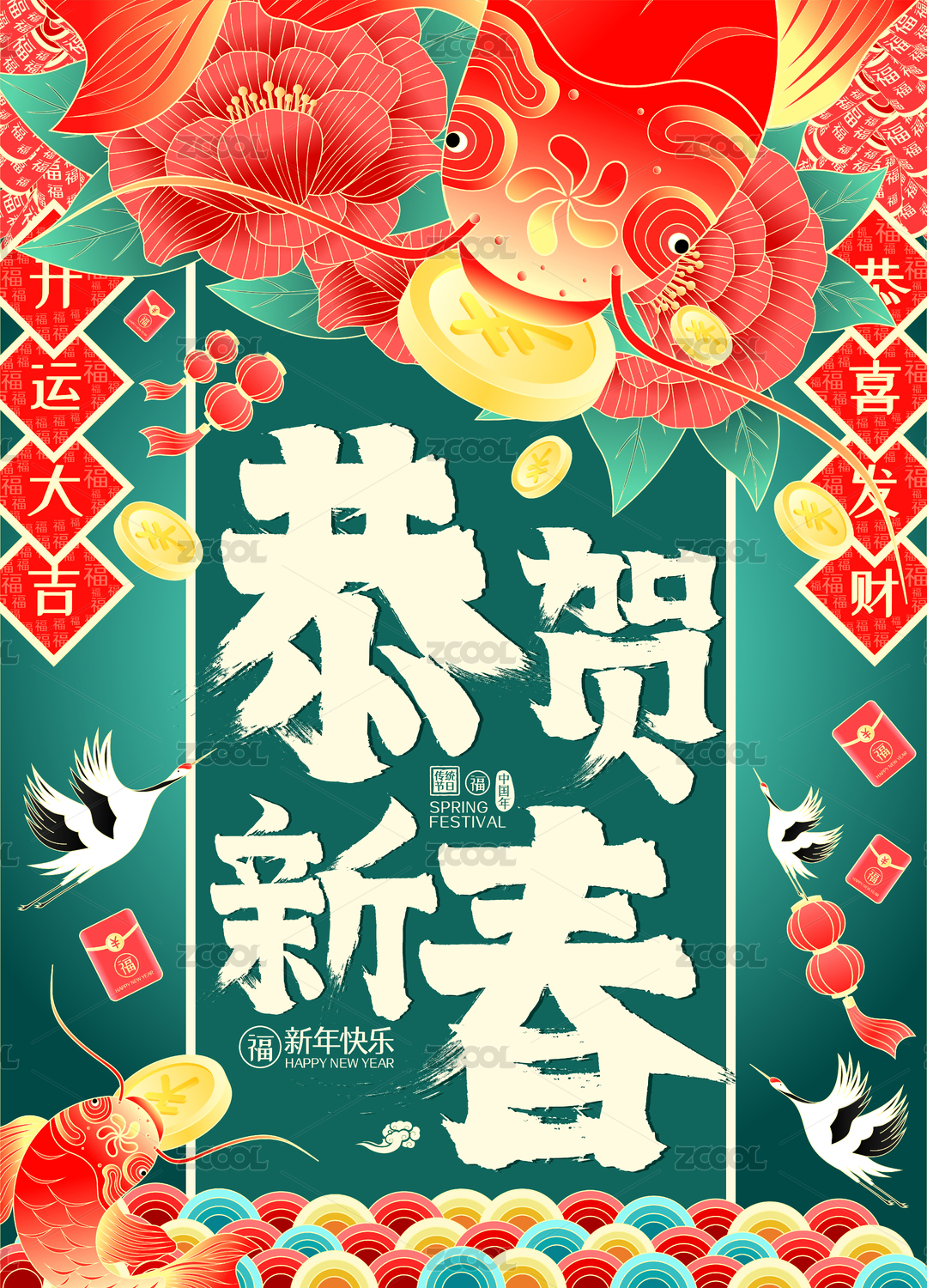 恭贺新春锦鲤牡丹仙鹤送福开运春节海报