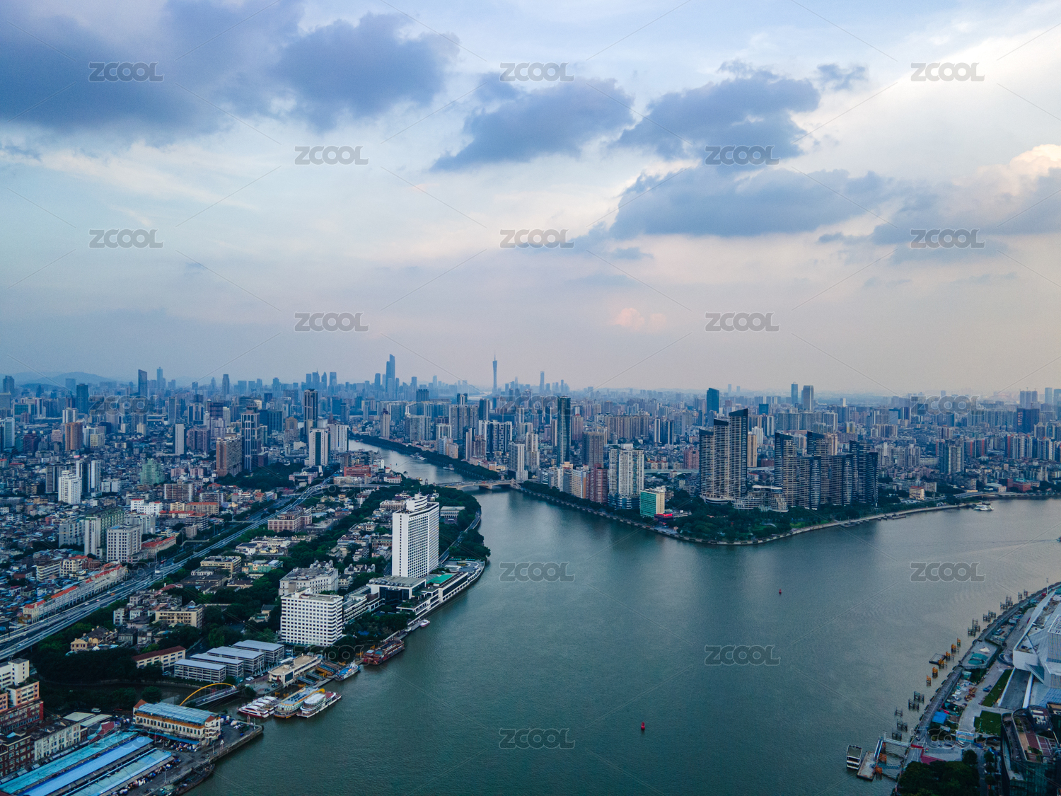 中国广州沙面白天鹅宾馆和白鹅潭商务区风光