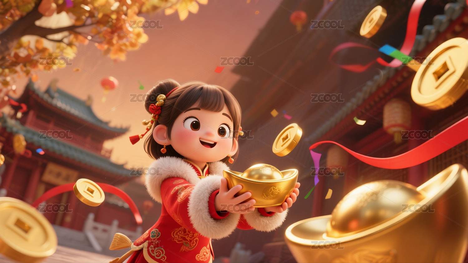 3d卡通插画手捧金元宝的红衣女孩贺新春