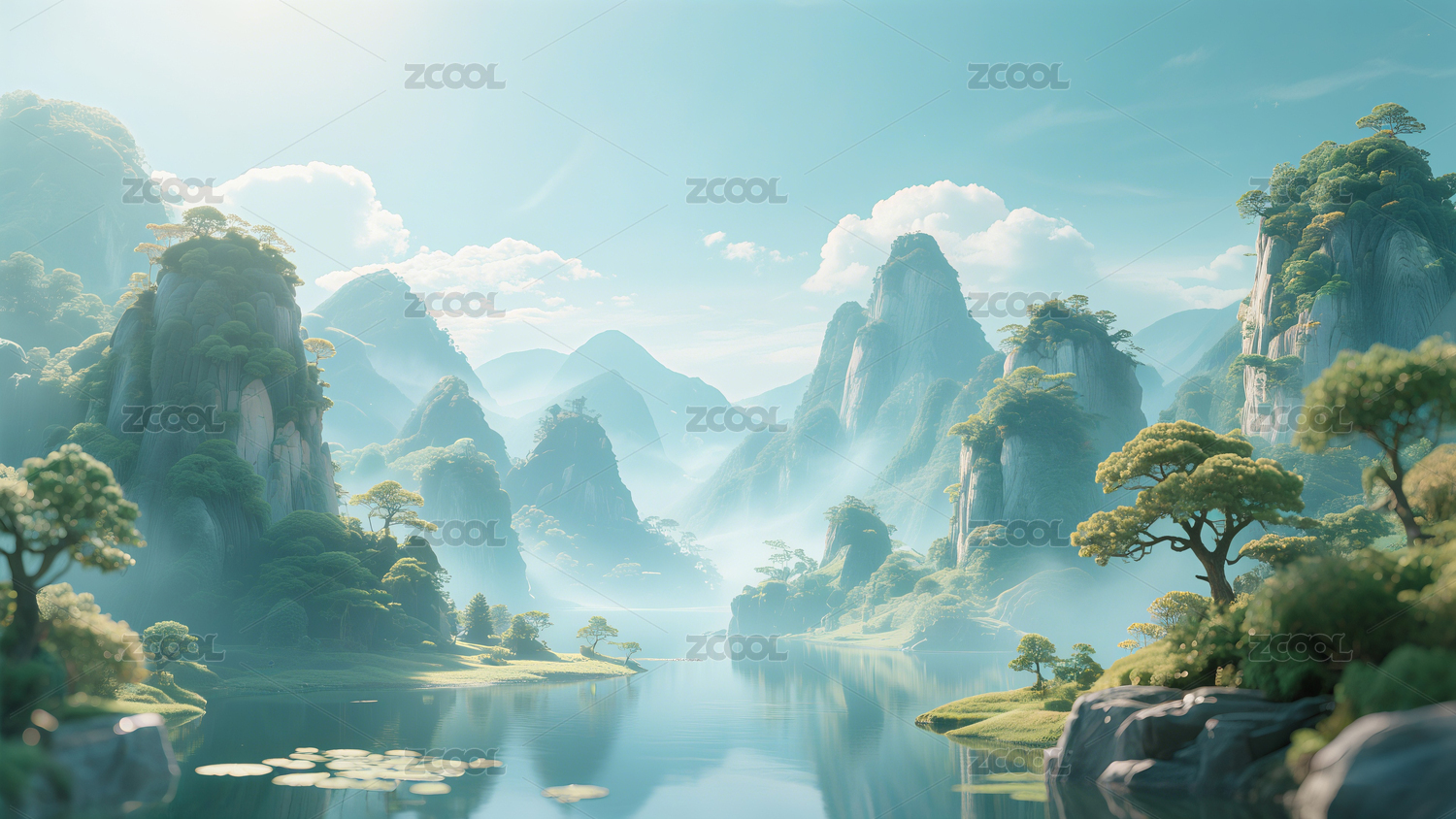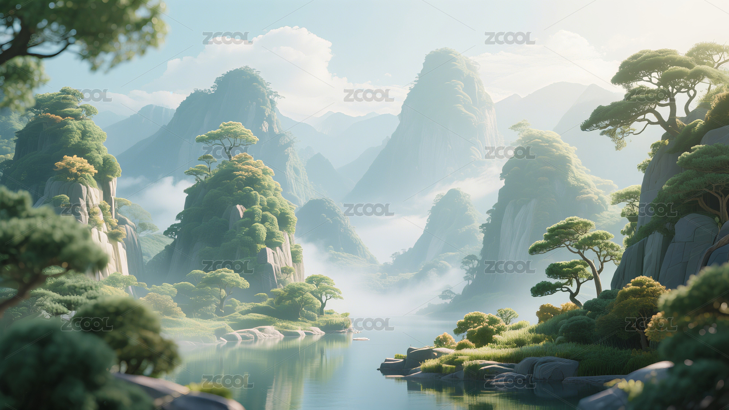 层峦叠嶂,绿色山峰,古风,中国风,山水画,写意画,水墨画,工笔画,中式素描,背景