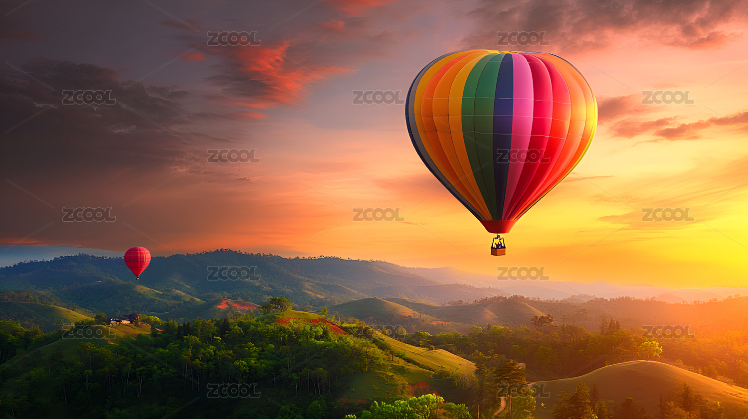 一只彩色热气球漂浮在山间湖泊上自然风景