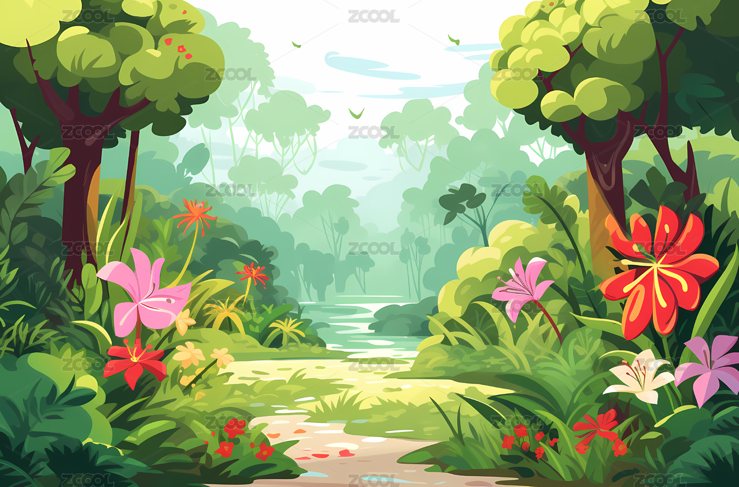 手绘卡通热带雨林插画背景