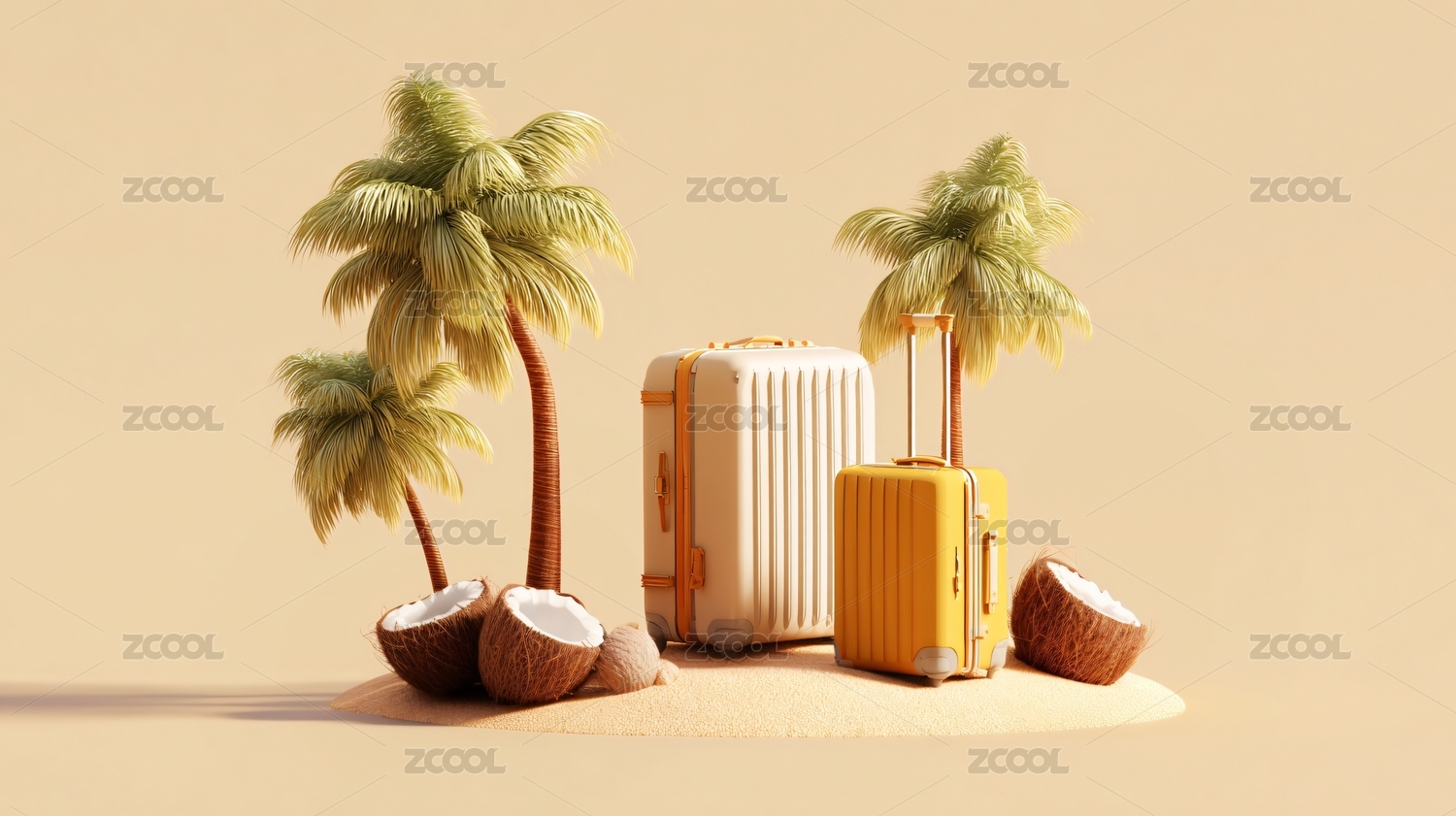 3D,旅游,行李箱,滑板,椰子树,海边,宣传,旅行,小清新,墨镜