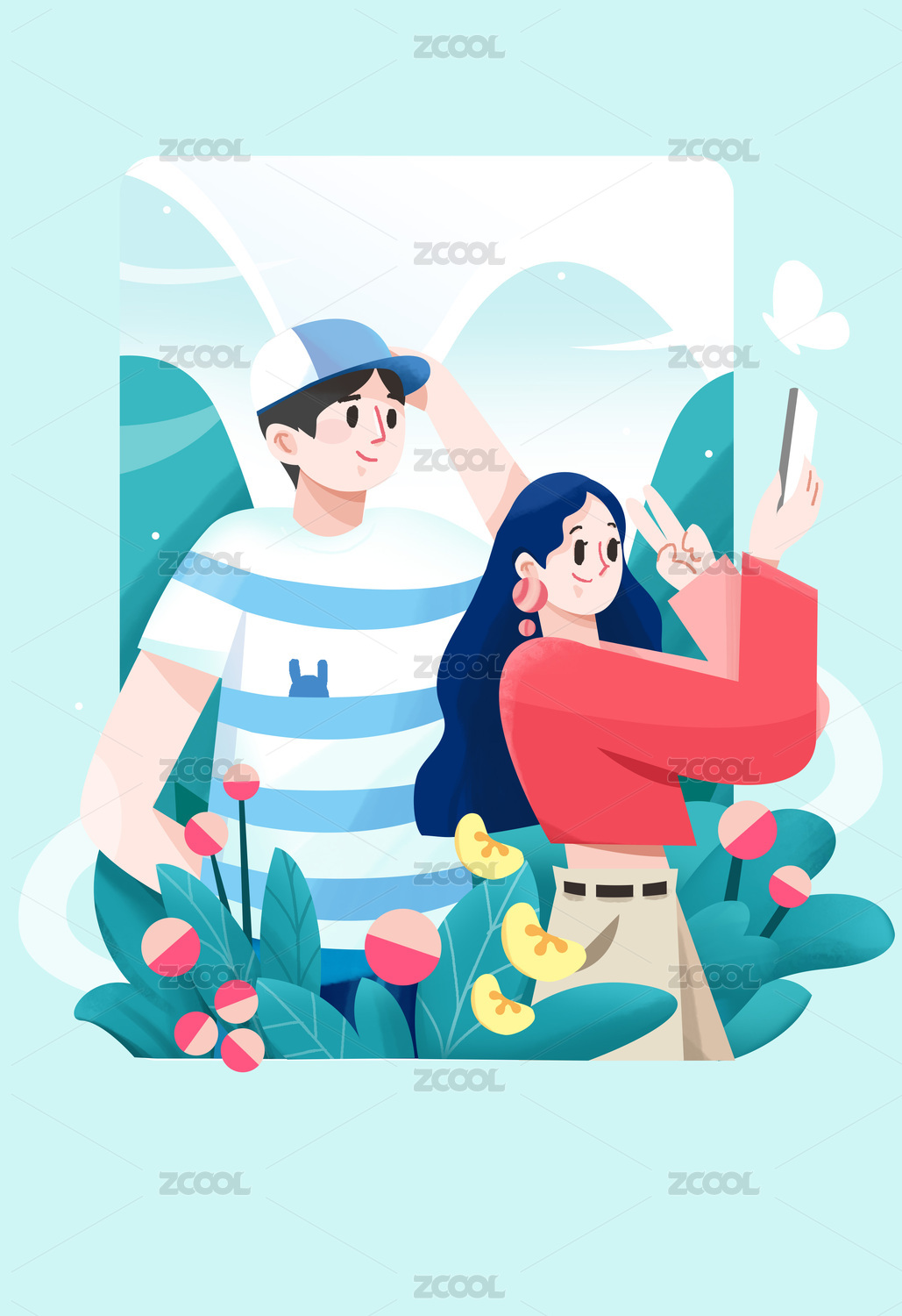 戴帽子男孩和红衣服女孩看风景自拍清新插画