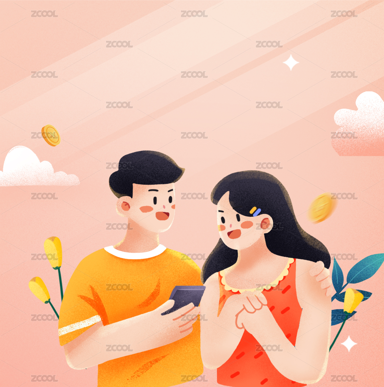 小清新粉色情侣情人节理财活动插画
