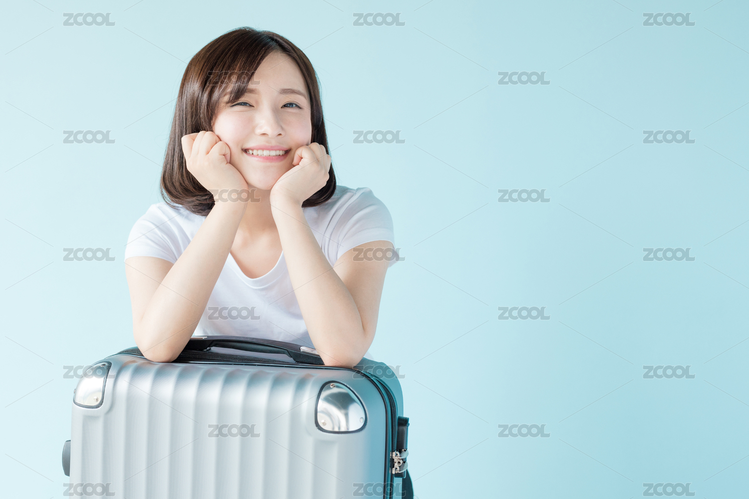 在木地板上思考的假期旅行和携带手提箱看着白色背景微笑漂亮的女人站在旅客。