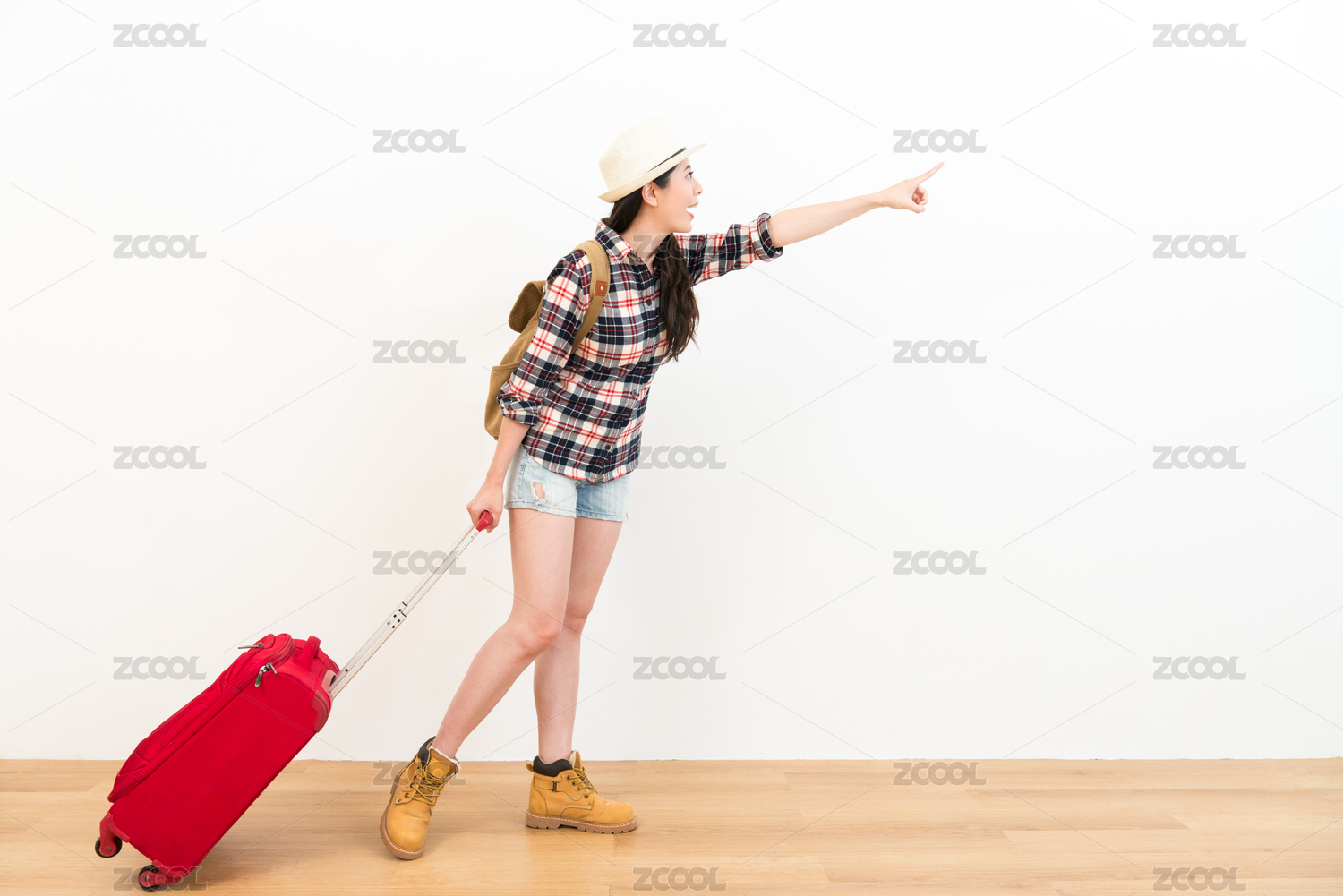 喜糖背包客小姐计划要去旅行和携带手提箱的个人走在白色的墙壁背景的木地板。