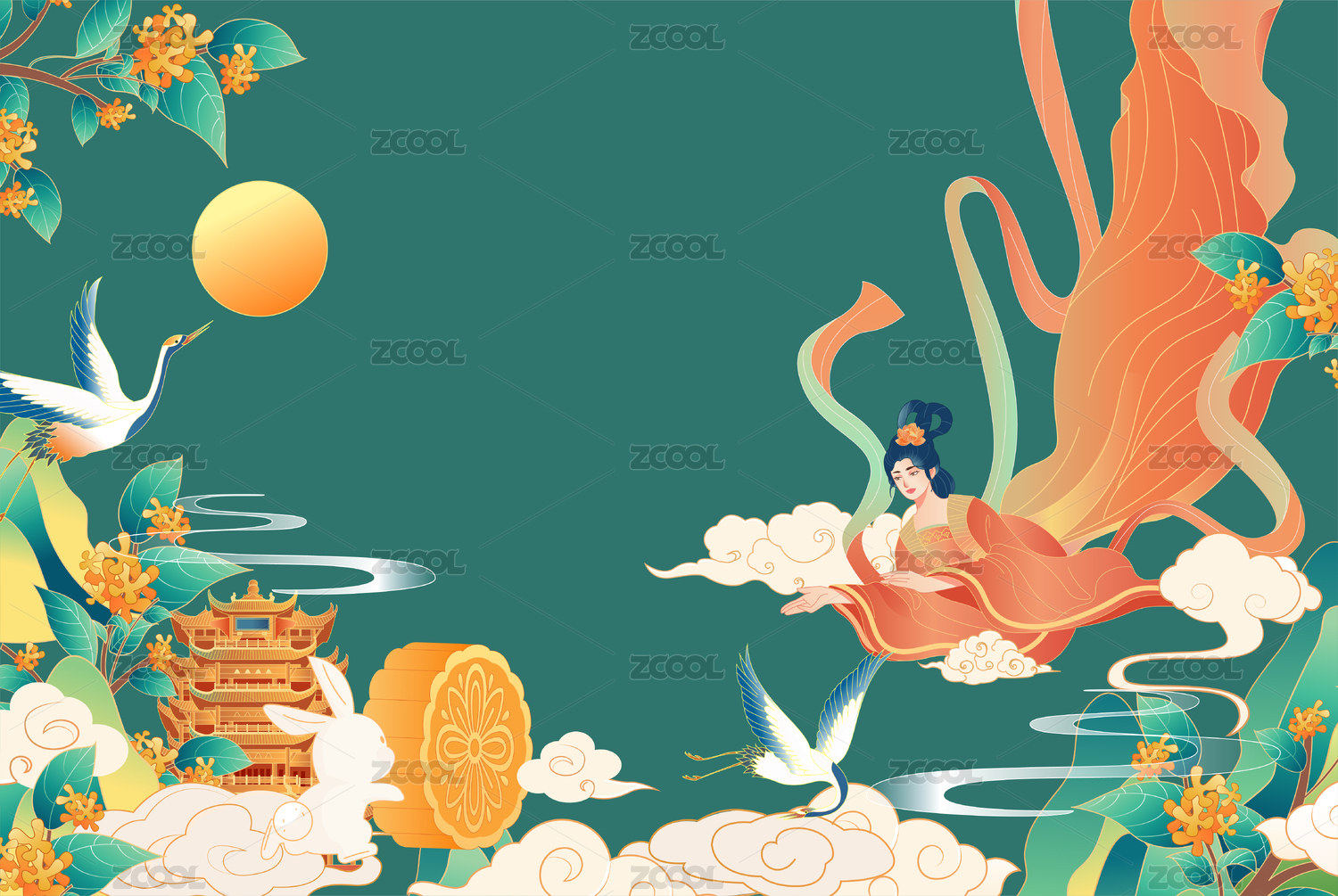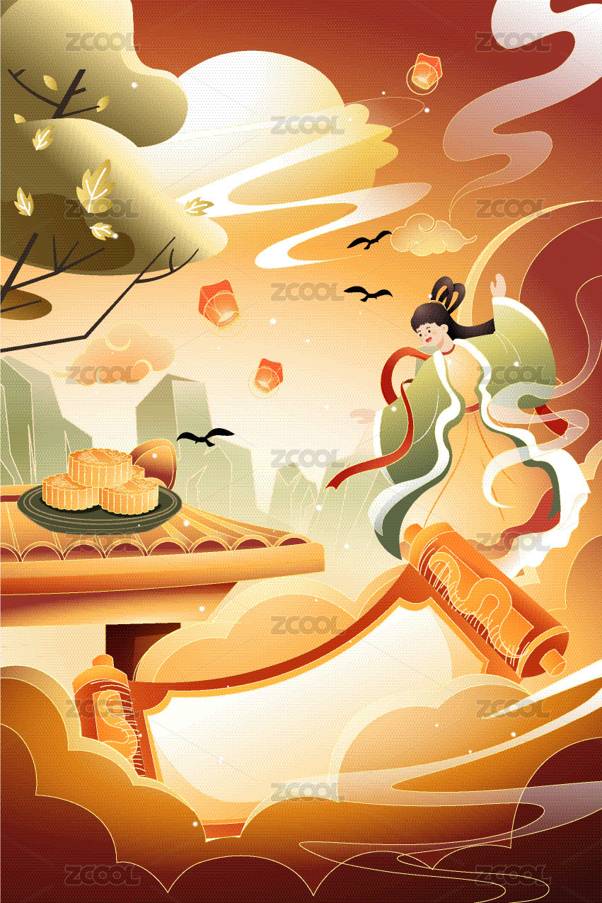 横版中秋节日嫦娥赏月国潮风矢量插画