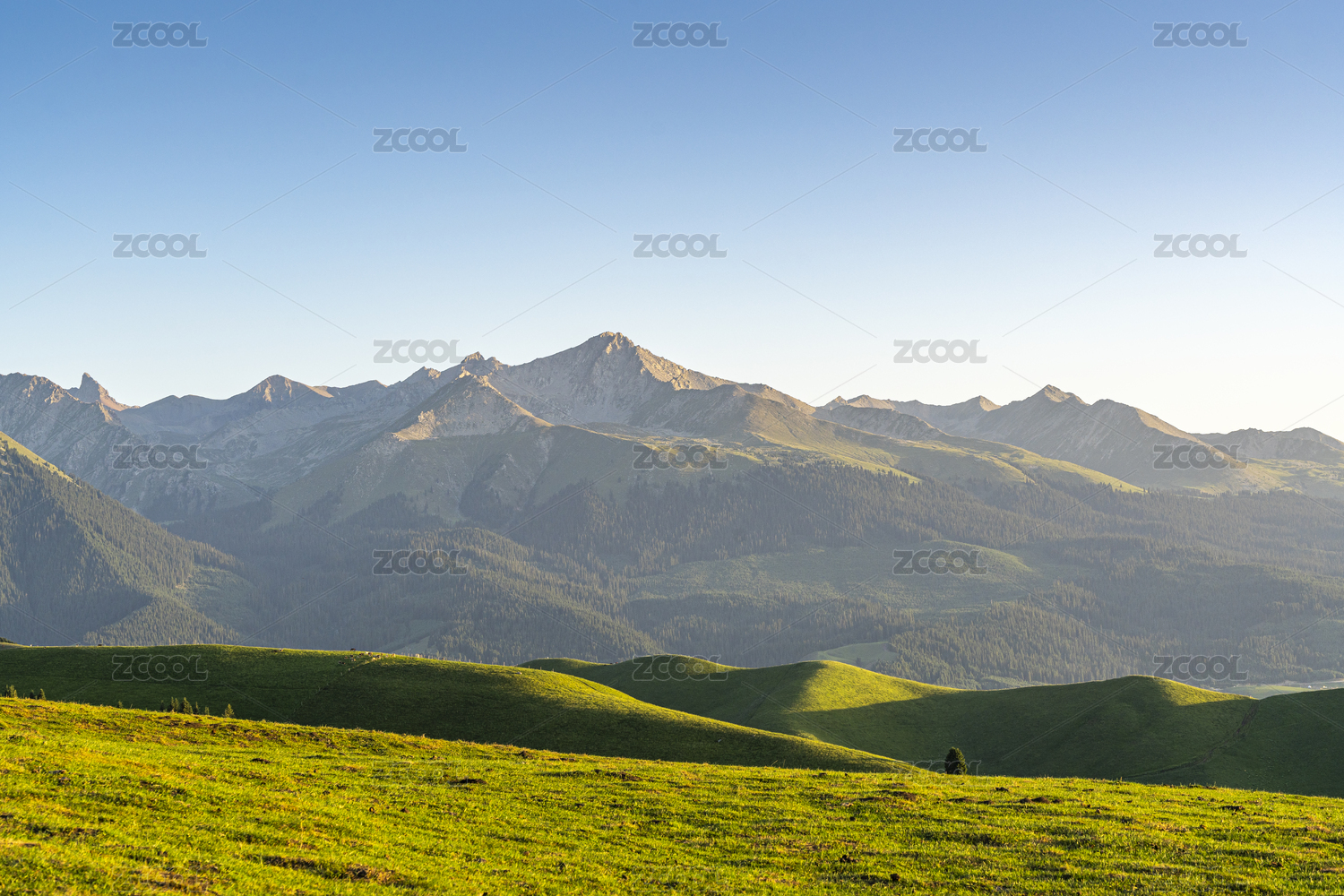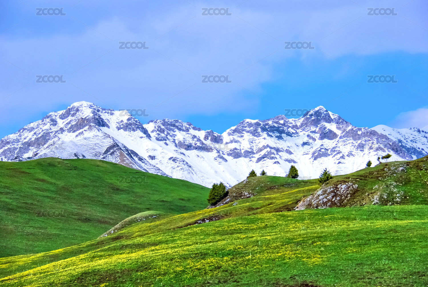 中国新疆伊犁那拉提的雪山草地森林与牧场