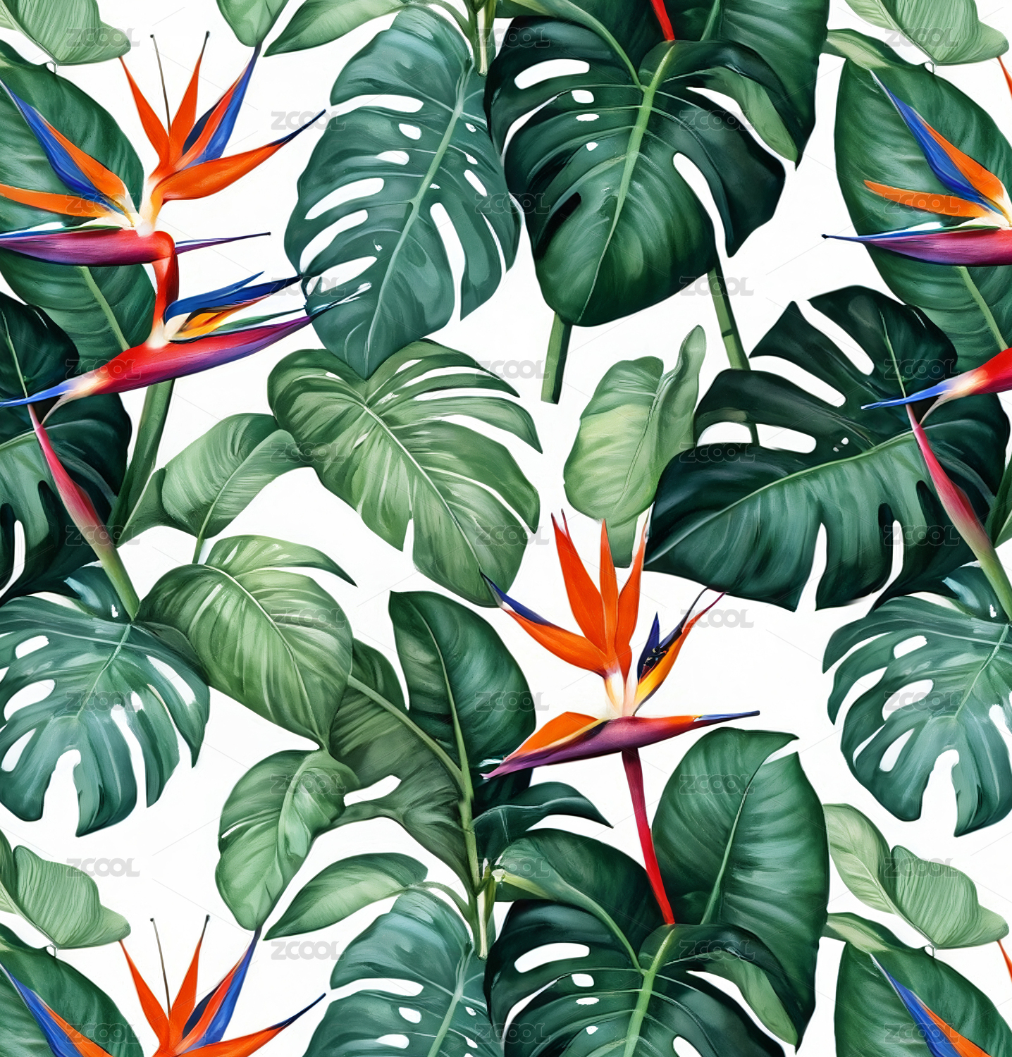 龟背竹,丛林,天堂鸟,热带花,热带植物,背景,四方连续,包装,服装图案,素材