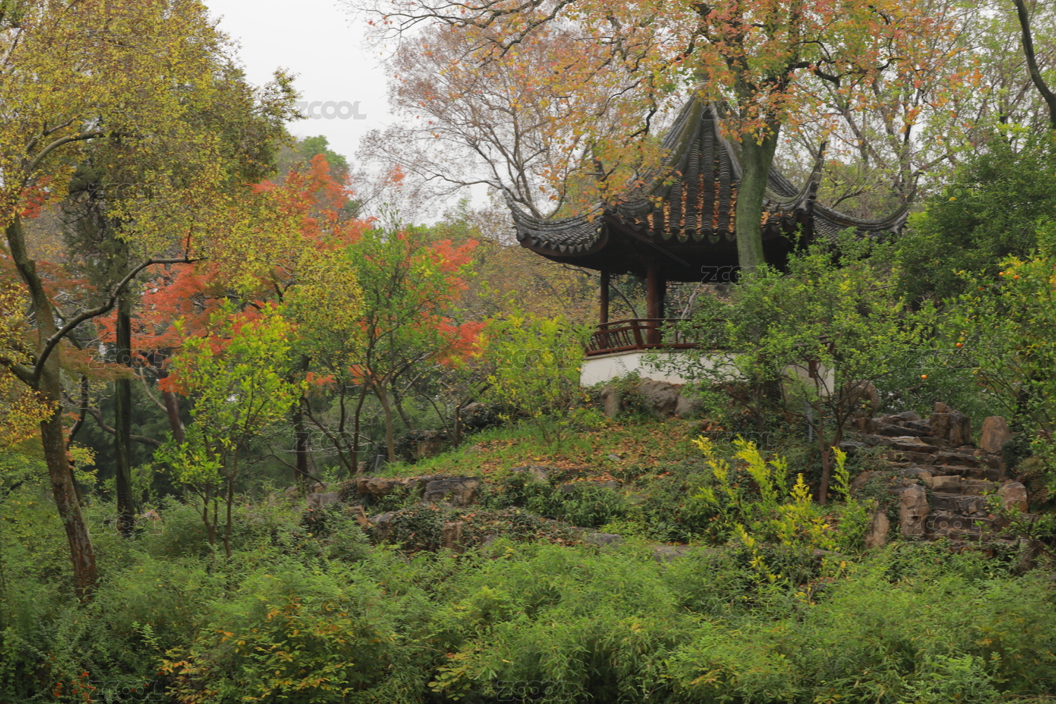 秋天公园的古建枫树