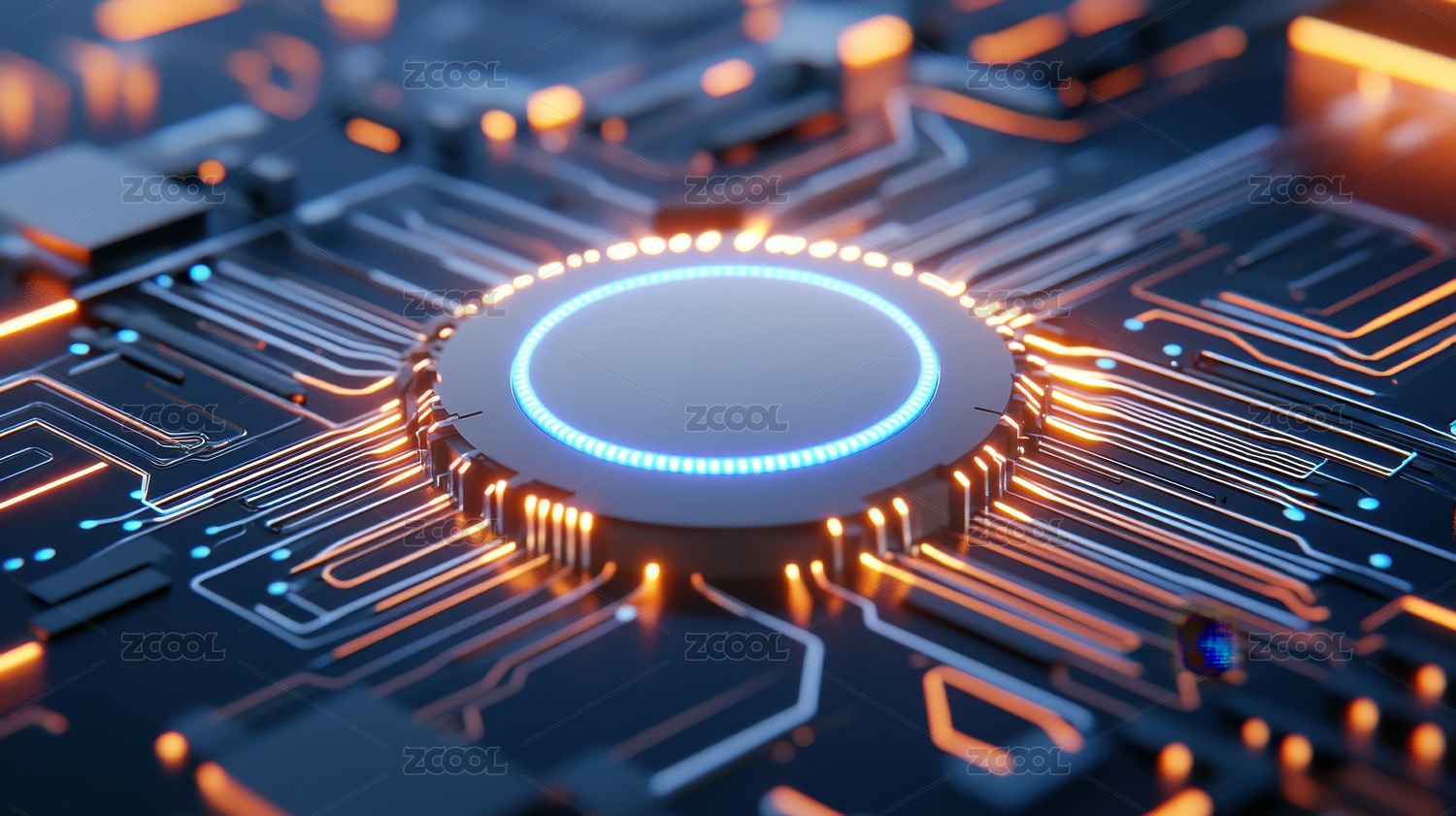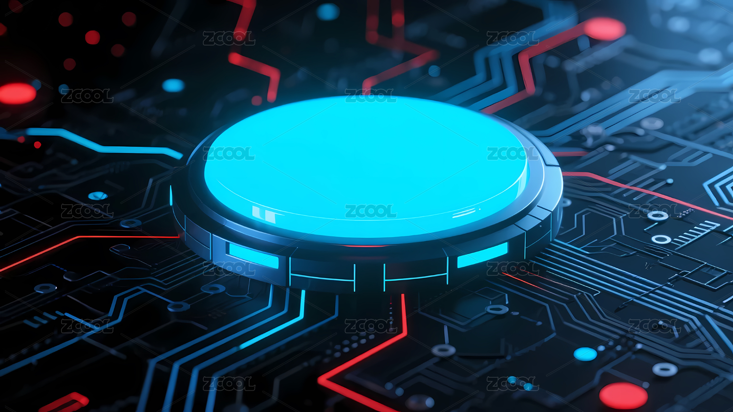 黑色圆形按钮在抽象电路板背景上闪烁蓝光