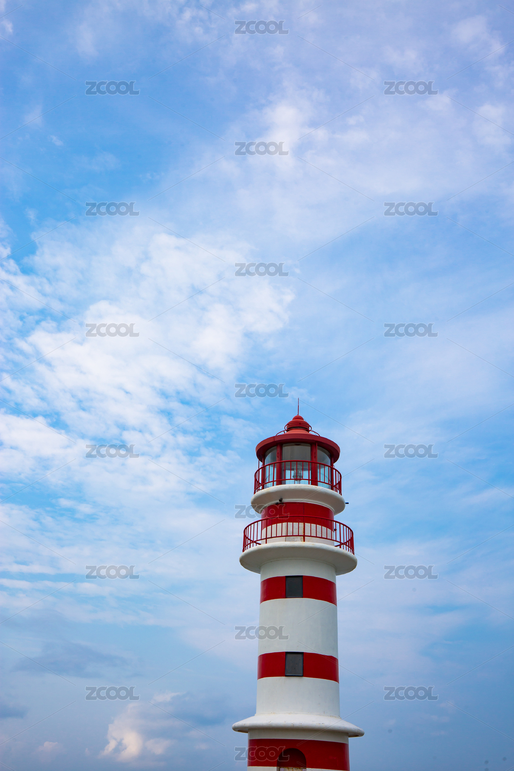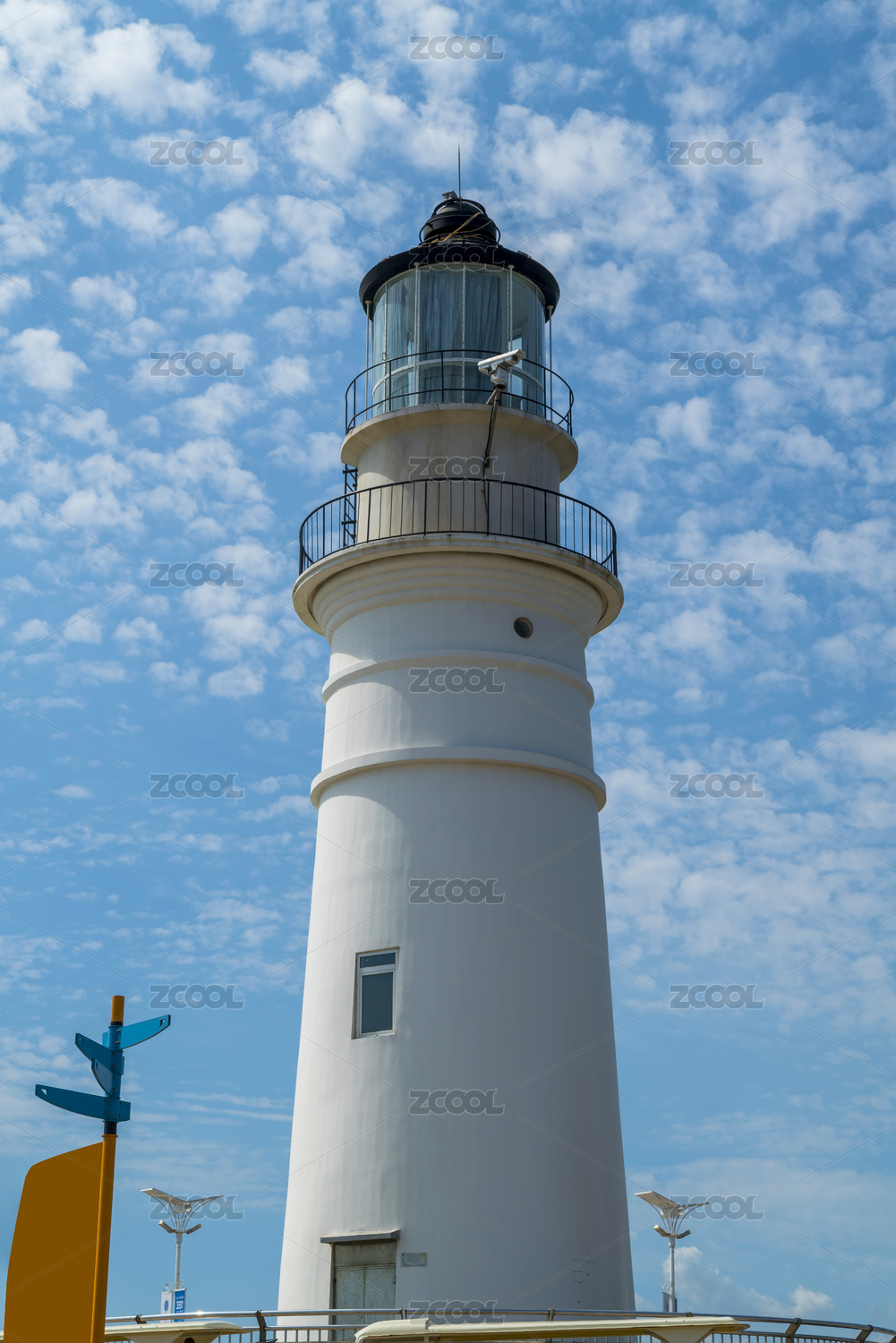 威海悦海公园晴朗蓝天下的灯塔俯视图