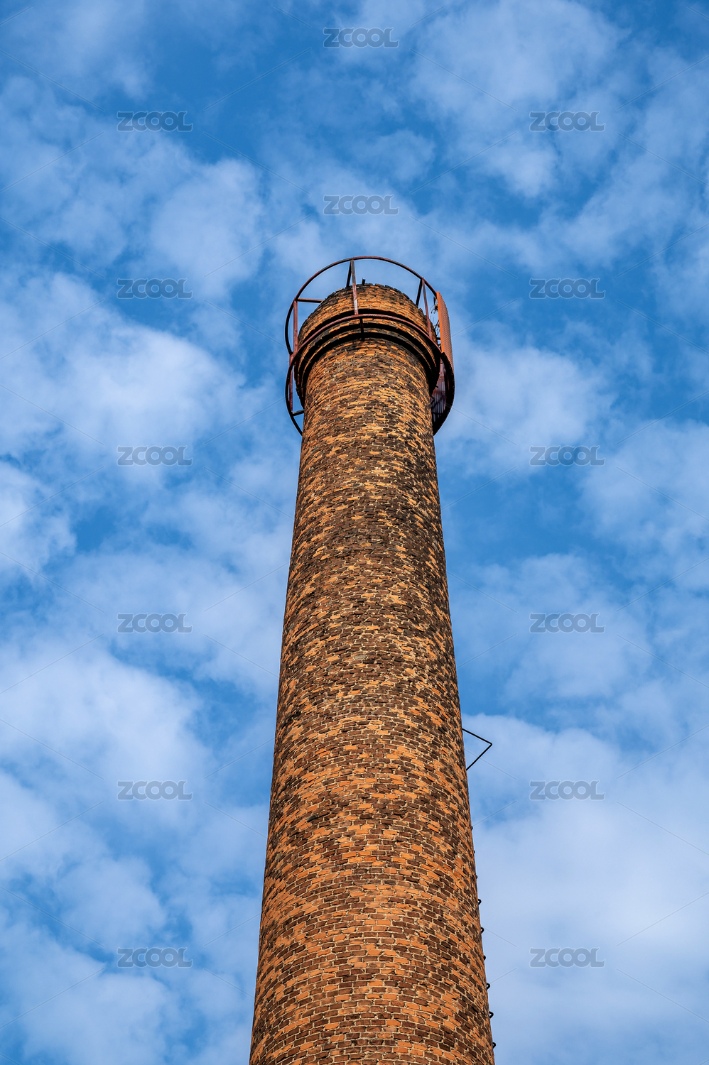 蓝天白云背景中红色砖墙大烟囱仰拍