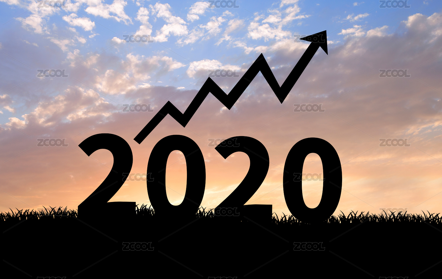 黄昏日落前的草地上2020剪影效果和增长箭头